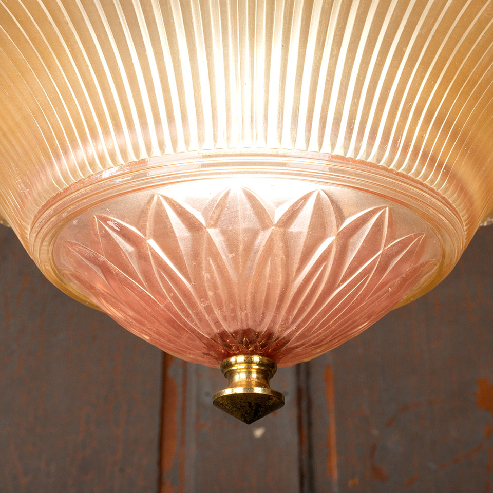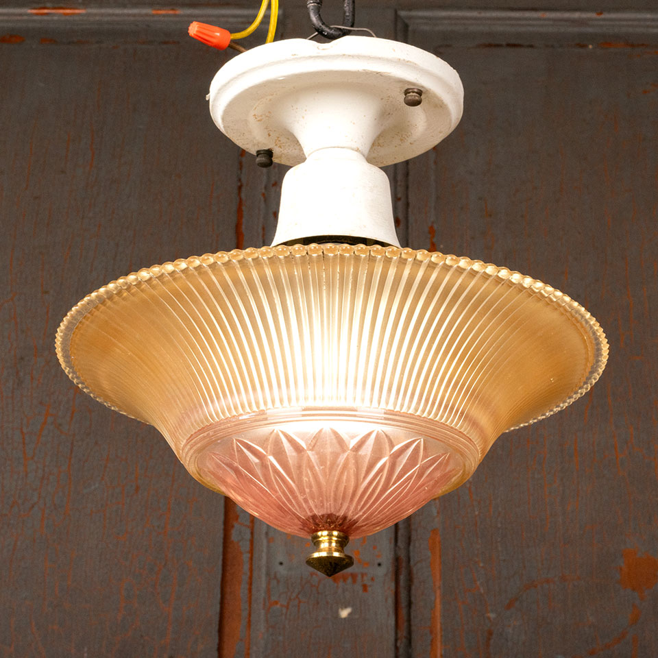 Vintage flush mount single light chandelier with colored glass shade measuring approx. 10 1/2" in diameter x 10" tall. See photos to evaluate condition.