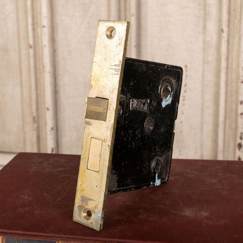 Architectural salvage antique brass and cast iron Russwin interior door reversible mortise latch lock hardware with skeleton keyhole deadbolt lock. Measurements: face plate 1" wide x 5 1/4" tall x 1/8" thick and body 1/2" wide x 3 5/8" tall x 3 1/4" front to back and a backset of 2 1/2". Spindle and keyholes measure 2 1/2" on centers. Key and strike plate NOT included. Color and condition vary, see photos to evaluate. Priced at $20/each.