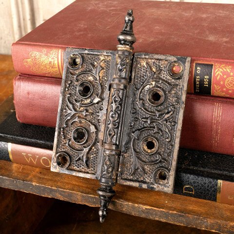 Architectural salvage antique ornate cast iron steeple finial door hinge measuring approx. 4" square (6 1/2" tall including finials).