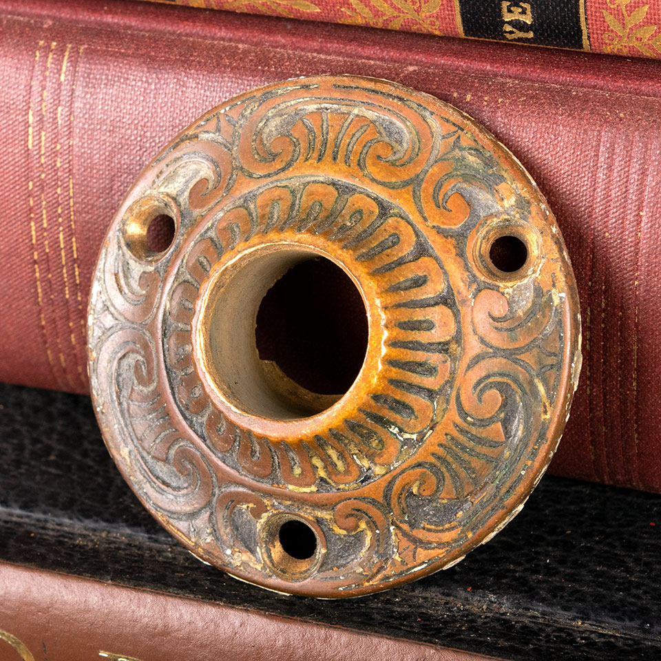 Architectural salvage antique bronze six fold pattern doorknob rosette door hardware measuring approx. 2 1/8" in diameter with a 3/4" diameter collar. Color and condition vary, see photos to evaluate. Priced at $25/each.