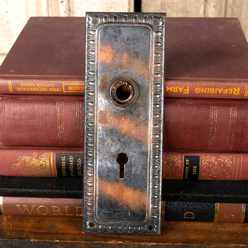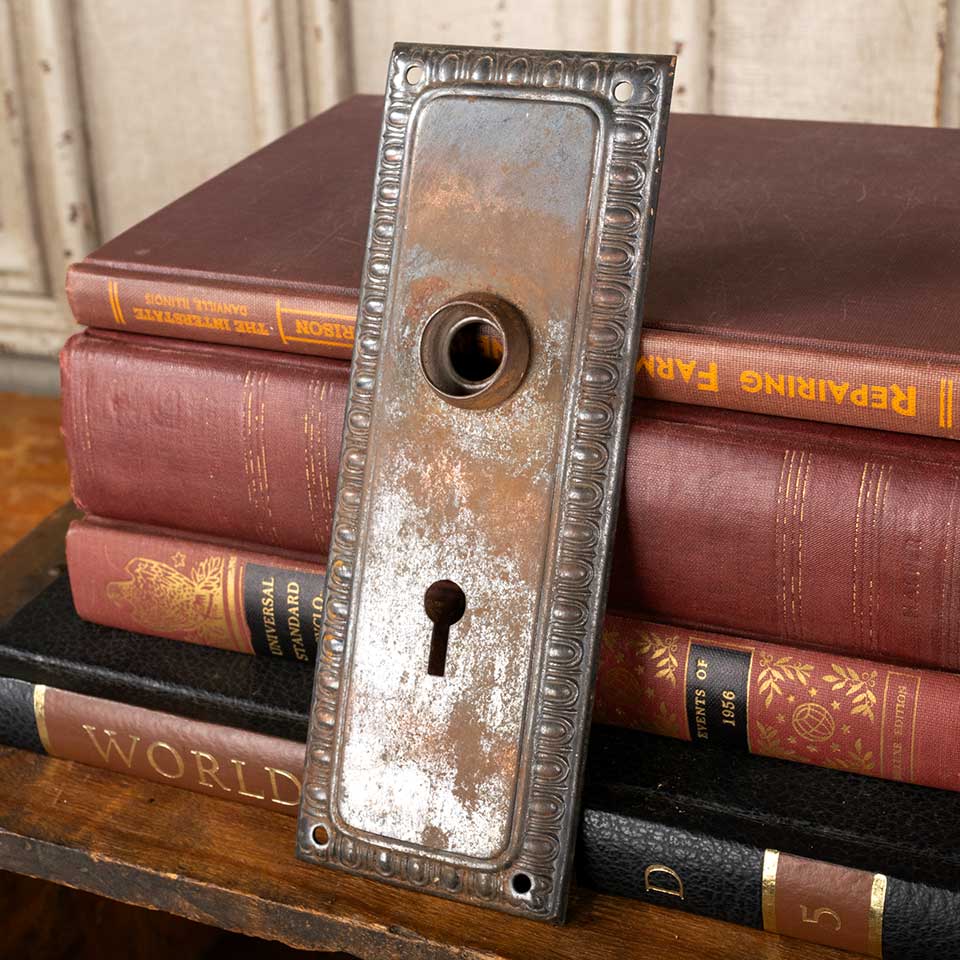 Antique architectural salvage metal doorknob backplate hardware with an egg & dart patterned border measuring approx. 2 1/2" wide x 7" tall with a 13/16" diameter collar. The spindle and keyholes measure 2 3/8" on centers. Color and condition vary, see photos to evaluate. Priced at $24/each.