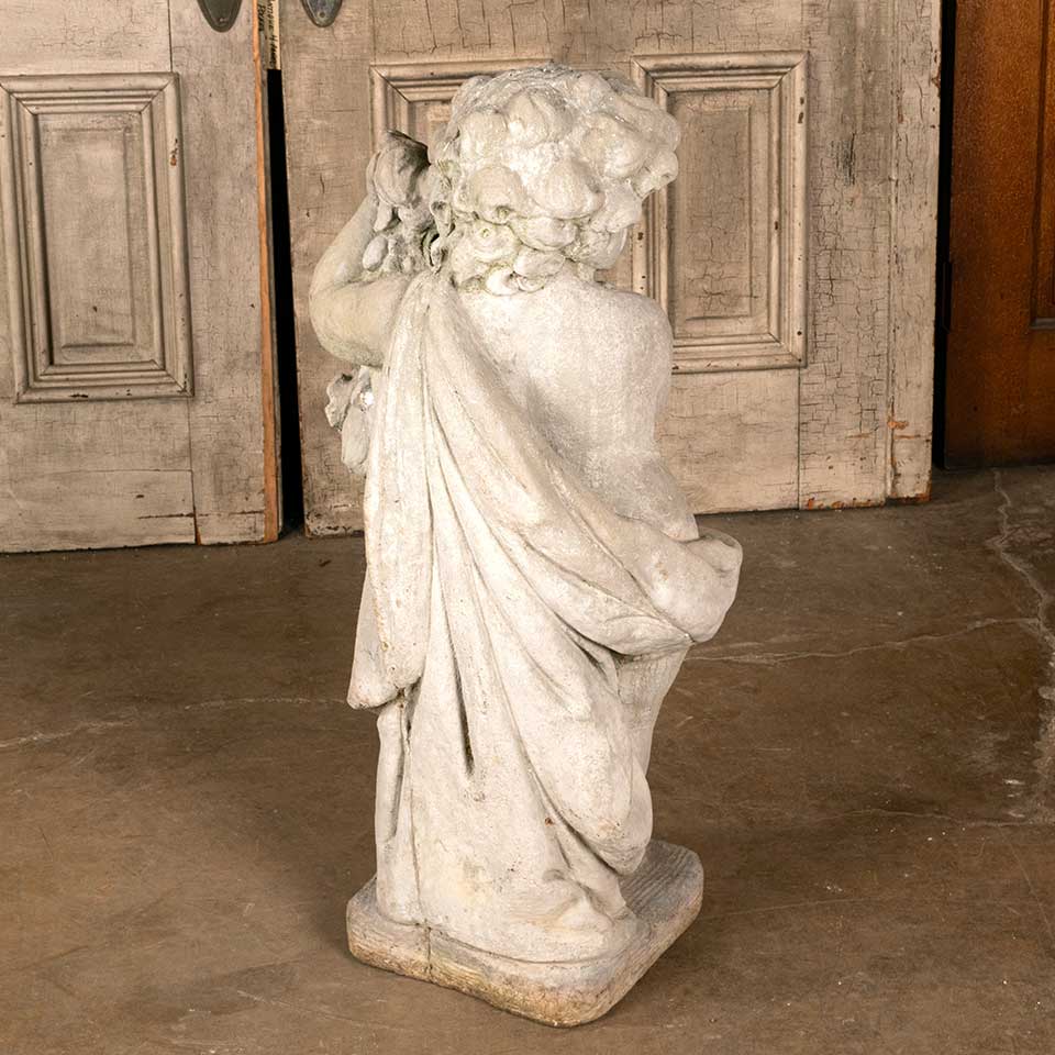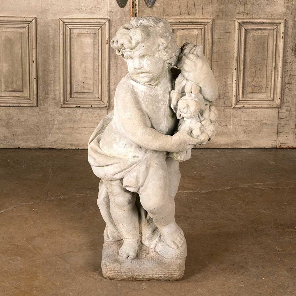 Cast concrete spring cherub garden statue measuring approx. 17" wide x 36" tall x 14" front to back. See photos to evaluate condition.