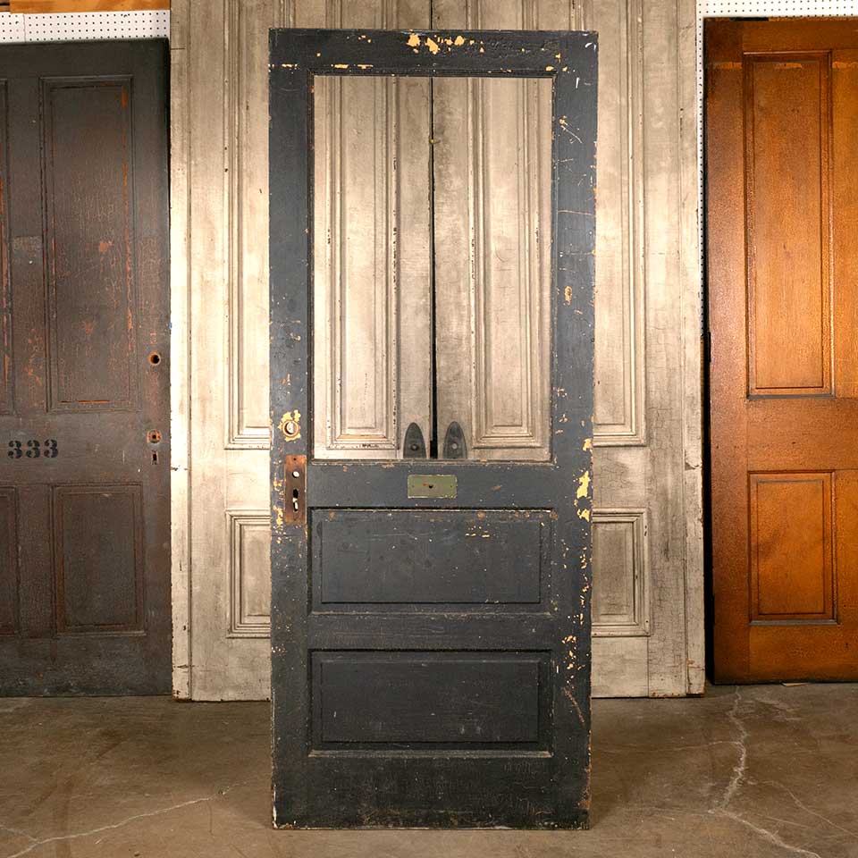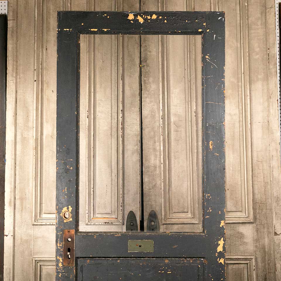 Architectural salvage antique wood half lite entry door with original wavy glass measuring approx. 33 3/4" wide x 83 1/2" tall x 1 3/4" thick. This door is painted on the exterior and natural on the interior. There's plexiglass in the opening and some of the interior glass bead molding is missing. See photos to evaluate condition.