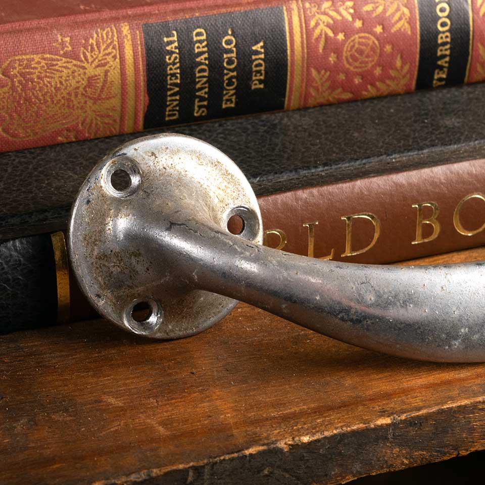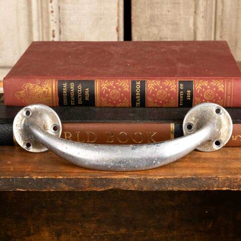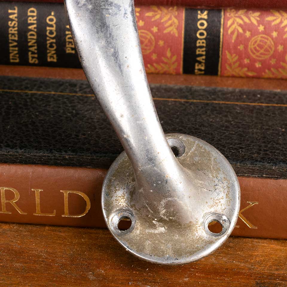 Architectural salvage antique chrome plated brass door or drawer pull handle hardware measuring approx. 7 1/4" wide x 2" tall x 1 1/2" front to back. See photos to evaluate condition. Priced at $65/each.