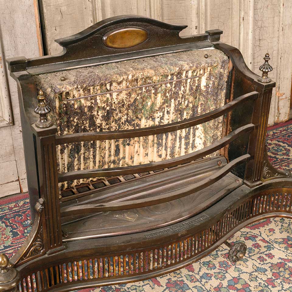 Architectural salvage antique No85 HUMPHREY-RADIANTFIRE ornate gas fireplace insert measuring approx. 28 3/4" wide x 23 1/2" tall x 12" front to back. The ceramic elements are missing. See photos to evaluate condition. This item is being sold for decorative use only.
