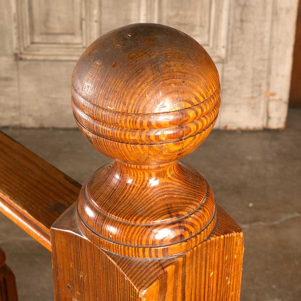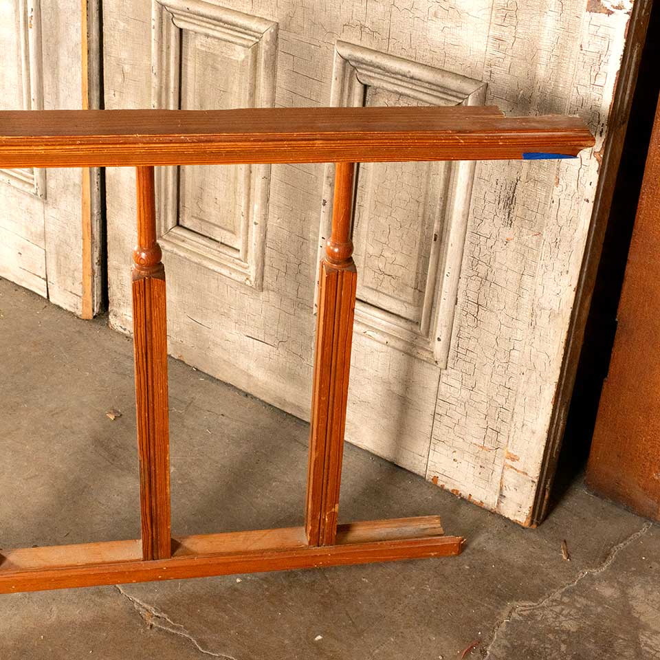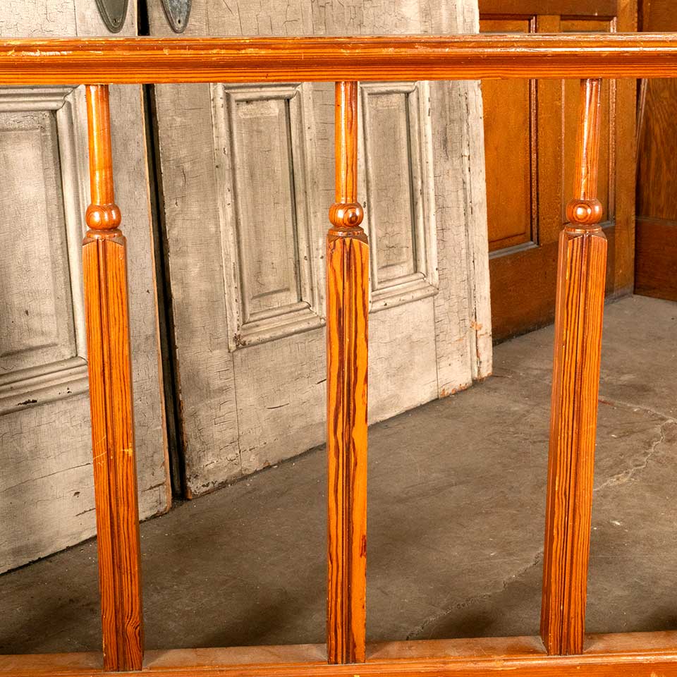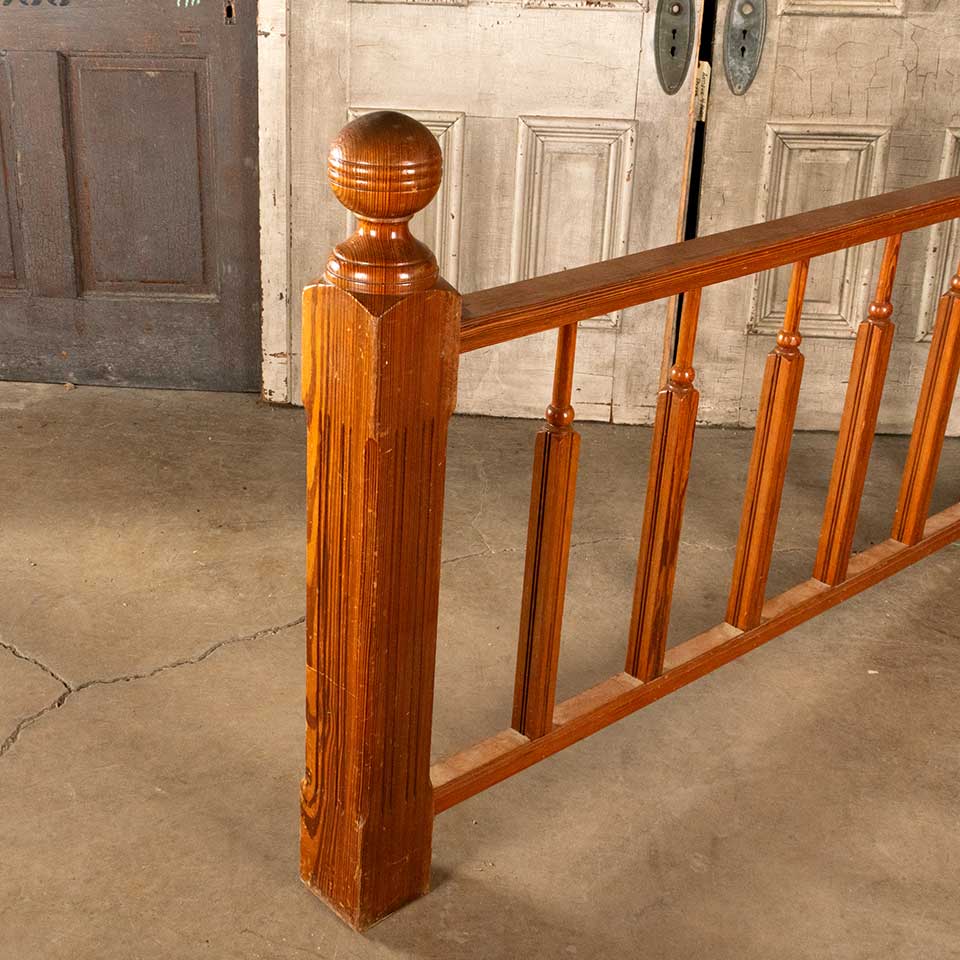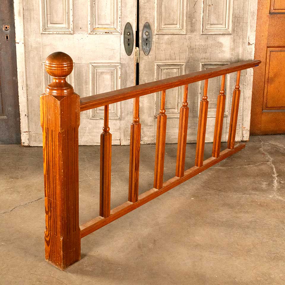 Architectural salvage solid pine wood interior engaged staircase gallery balcony balustrade railing section with newel post, handrail, and balusters / spindles measuring approximately 80" long (including the newel post) x 31" tall x 3 1/2" wide overall. The newel post measures approx. 4 7/8" square x 40 1/4" tall. See photos to evaluate condition.