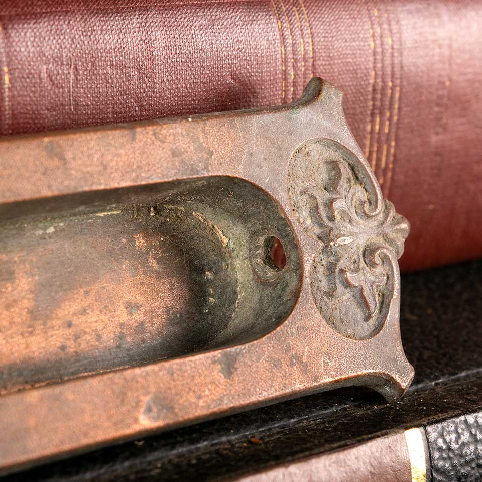 Architectural salvage antique ornate bronze window sash lift hardware measuring approx. 3 7/8" wide x 1 5/8" tall x 1/2" front to back. The recessed area measures approx. 2 3/8" wide x 7/8" tall. Color and condition vary, see photos to evaluate. Priced at $45/each.