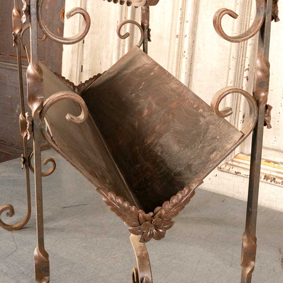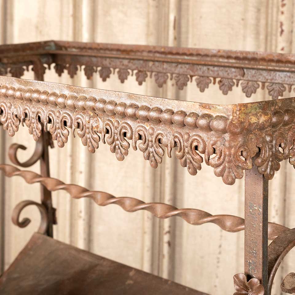Antique ornate wrought iron metal table base with lower V shelf measuring approx. 24 1/4" wide x 24 3/4" tall x 12 1/4" front to back. There's no glass in the inset top. See photos to evaluate condition.