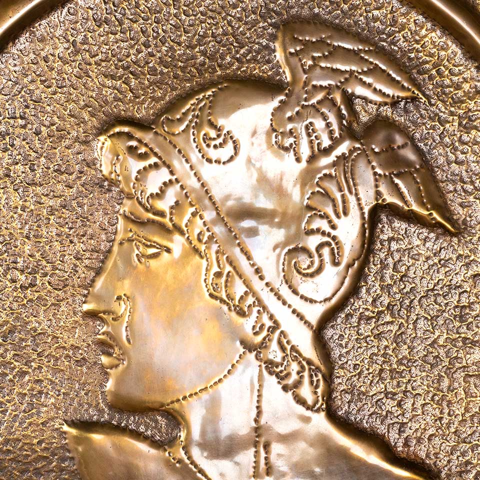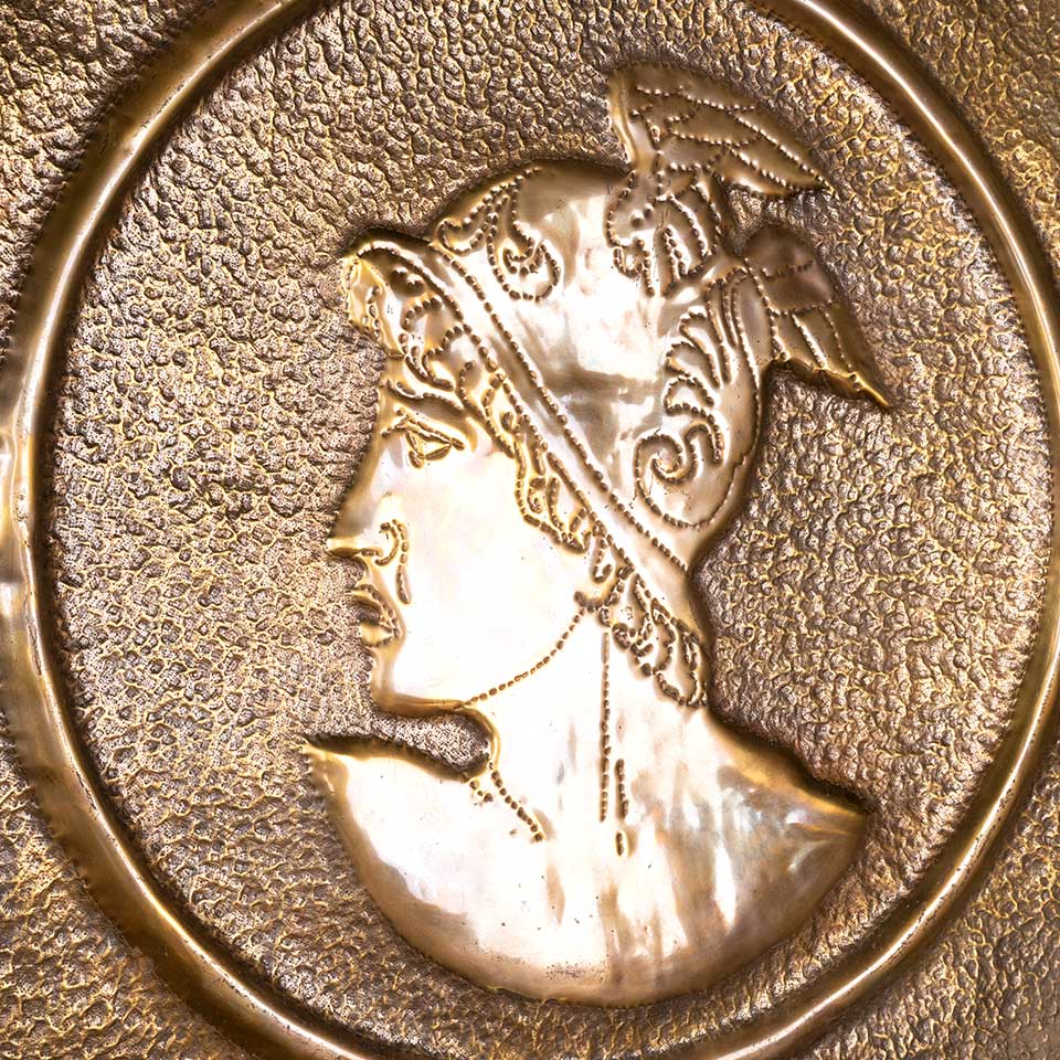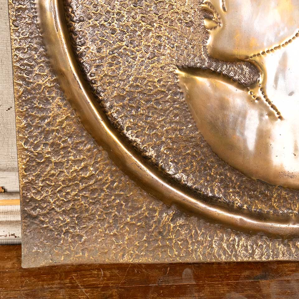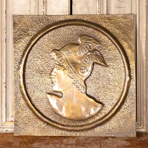 Architectural salvage antique pressed metal figural panel with a silhouette of Mercury in relief measuring approx. 23 1/8" wide x 23 1/2" tall x 1/2" front to back. Condition is consistent with age and use, see photos to evaluate.