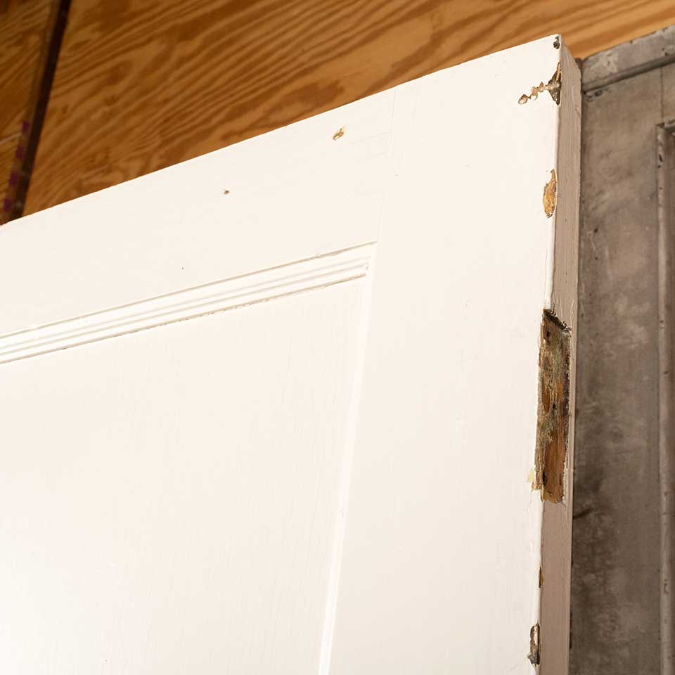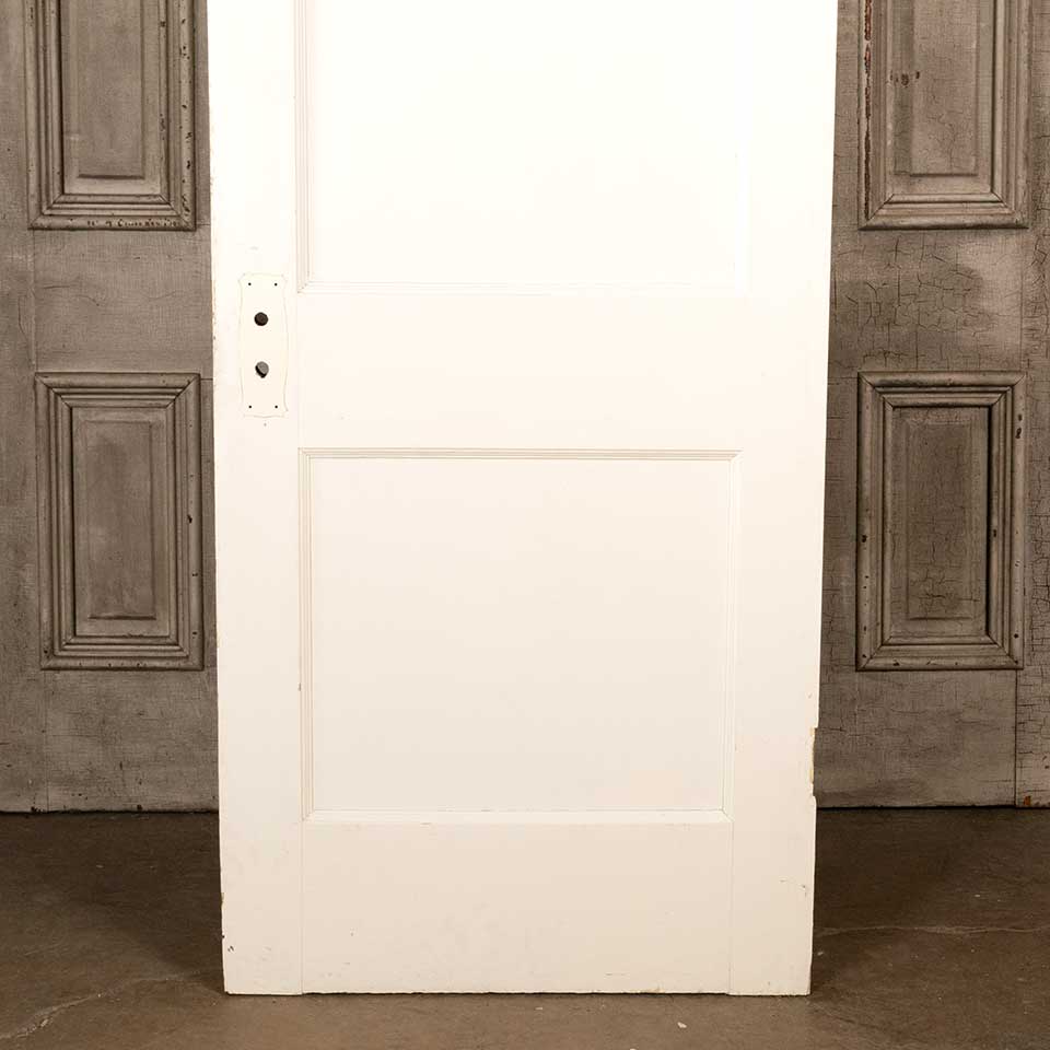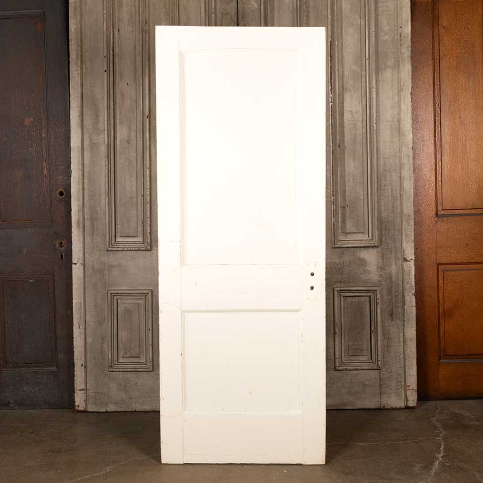 Architectural salvage antique two panel painted wood interior door measuring approx. 29 3/4" wide x 77 1/4" tall x 1 3/8" thick. See photos to evaluate condition.