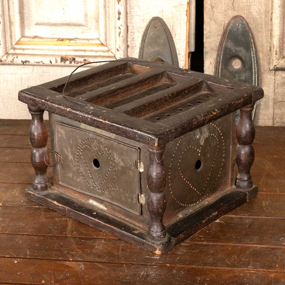 Antique early 19th century primitive wood and metal foot warmer with pierced tin heart motif measuring approx. 9" wide x 5 3/4" tall x 7 3/4" front to back. See photos to evaluate condition.