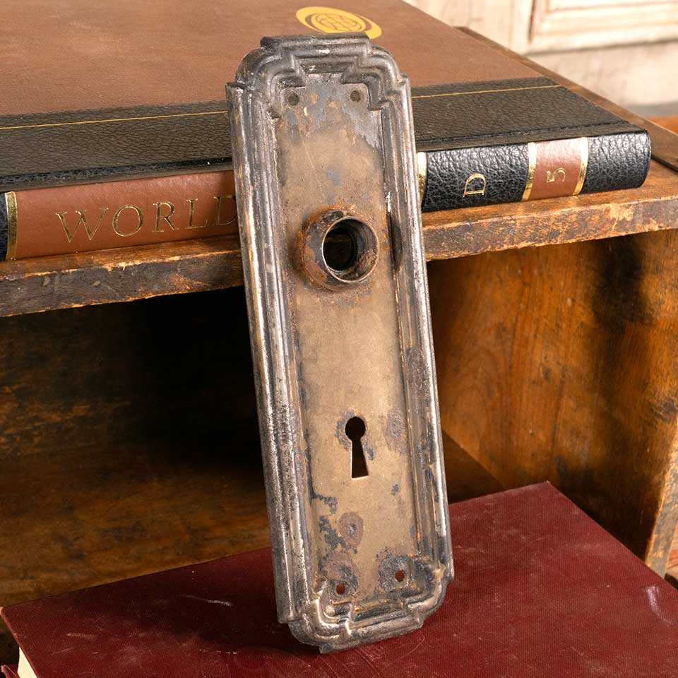 Architectural salvage antique Arts & Crafts metal doorknob backplate hardware measuring approx. 2 1/2" wide x 7 1/2" tall with a 3/4" diameter collar. The spindle and keyhole measure 2 1/2" on centers. Condition and color may vary, see photos to evaluate. Priced at $20/each.