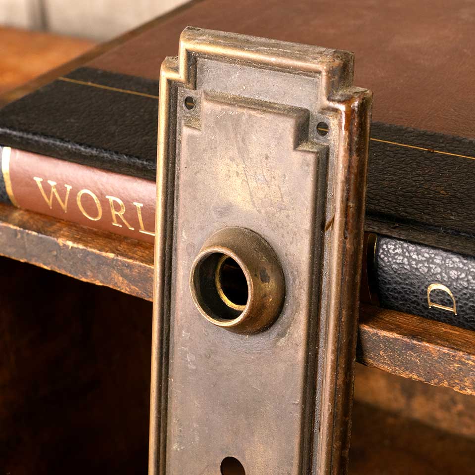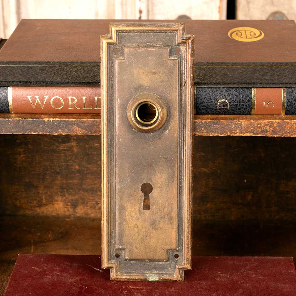 Architectural salvage antique brass Arts & Crafts doorknob backplate door hardware measuring approx. 2 5/8" wide x 7 1/2" tall with a 7/8" diameter collar. The spindle and keyhole measure 2 1/2" on centers. Condition and color may vary, see photos to evaluate. Priced at $22/each.