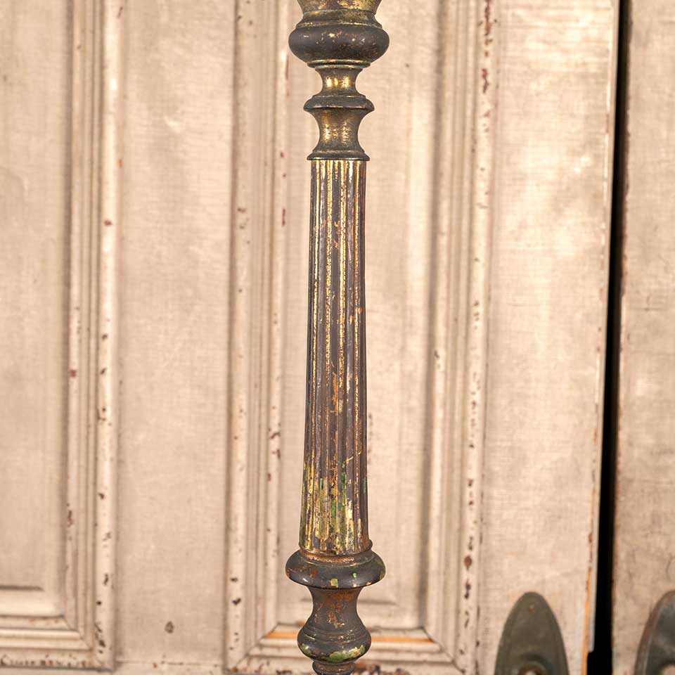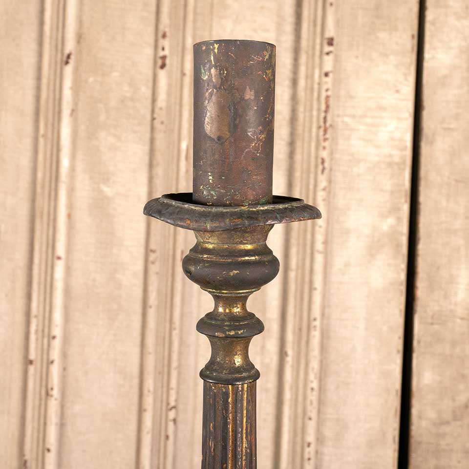 Antique cast brass footed figural religious candle stick holder measuring approx. 18" tall with a 5 1/2" diameter base. The top rim is bent and the shaft is loose on the base, but it doesn't come off. See photos to evaluate condition.