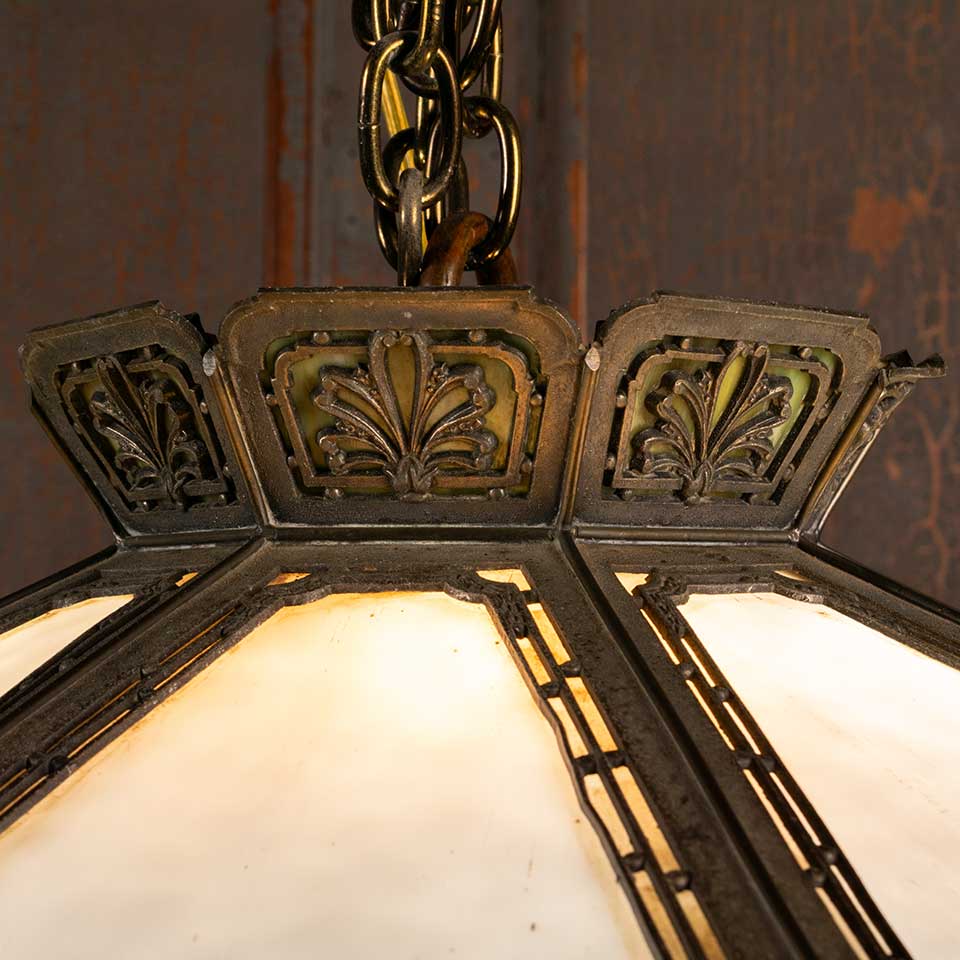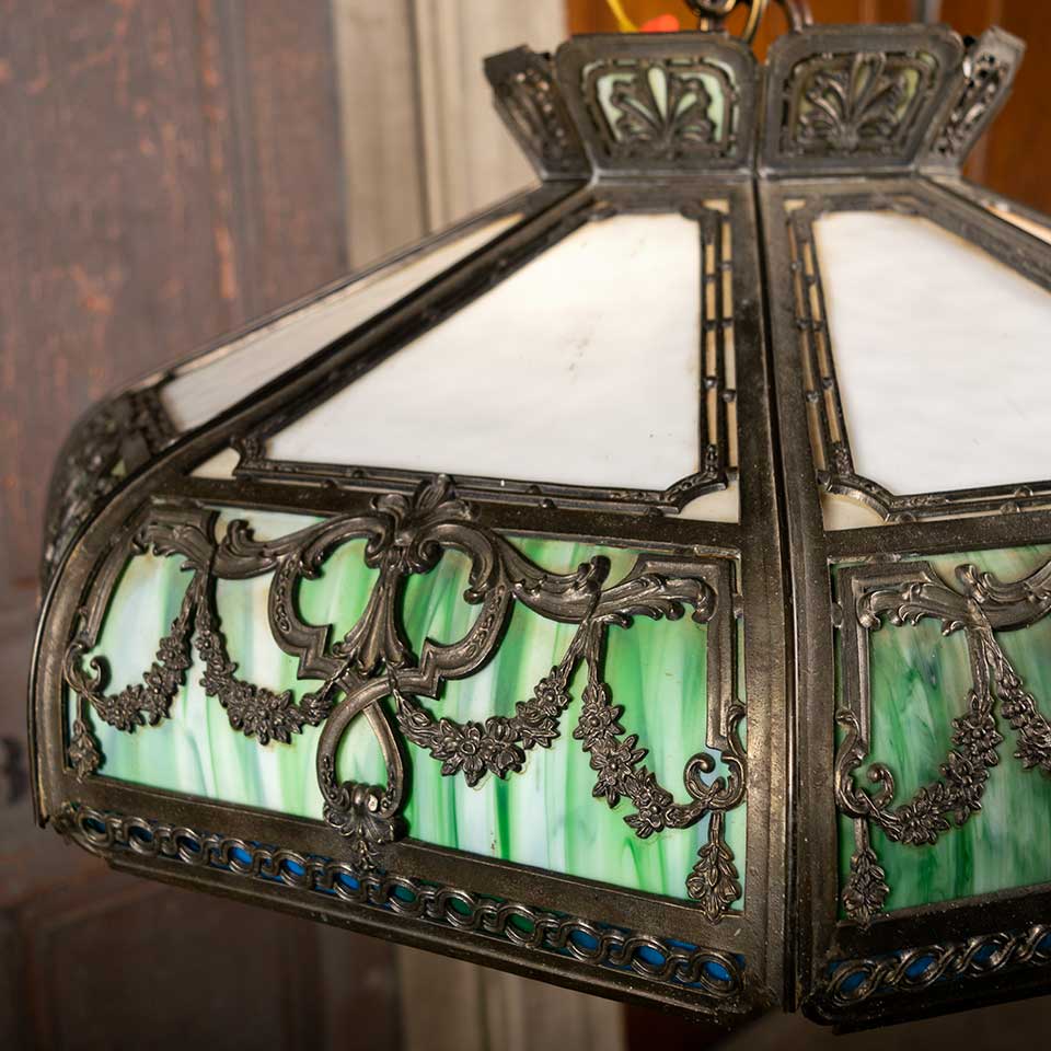 Antique architectural salvage stained slag glass chandelier with filigree frame measuring approx. 26 1/2" in diameter x 11" tall with an 89" long chain and ceiling canopy. This fixture takes 6 medium base bulbs. See photos to evaluate condition. Salvaged lighting should be inspected by a licensed electrician before installation.