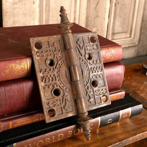 Architectural salvage antique Victorian Eastlake cast iron steeple finial door hinge hardware measuring approx. 4 1/2" square (7 3/4" tall including finials). See photos to evaluate condition.