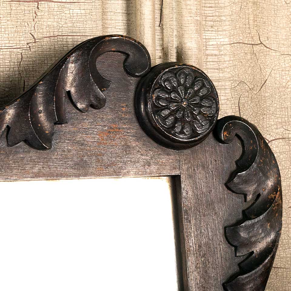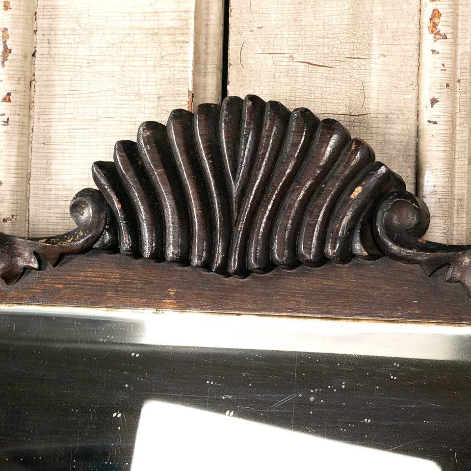 Architectural salvage antique beveled glass mirror in wood frame measuring approx. 30" wide x 23" tall x 1 3/4" front to back. See photos to evaluate condition.