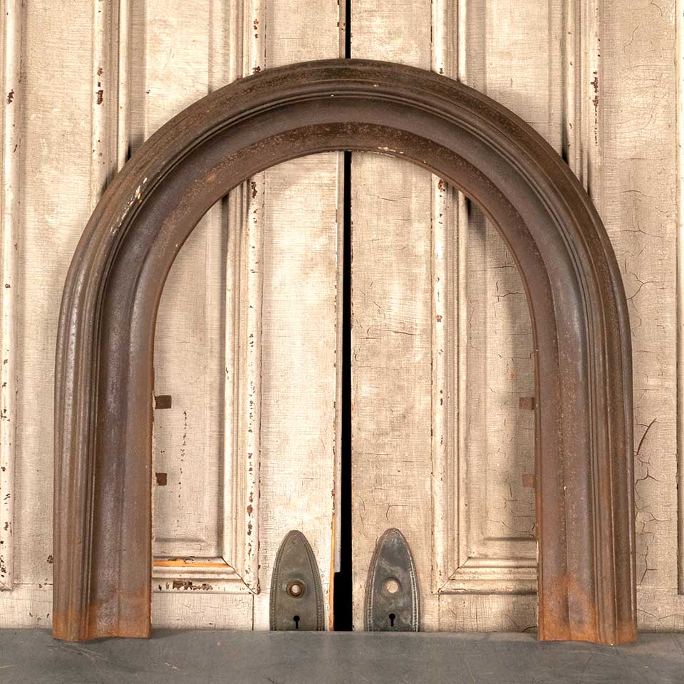 Architectural salvage antique arched top cast iron fireplace surround measuring approx. 32 7/16" wide (at base) x 32 3/4" tall x 1 3/4" front to back. The interior arched top firebox opening measures approx. 21 3/8" wide x 27 1/4" tall. See photos to evaluate condition.