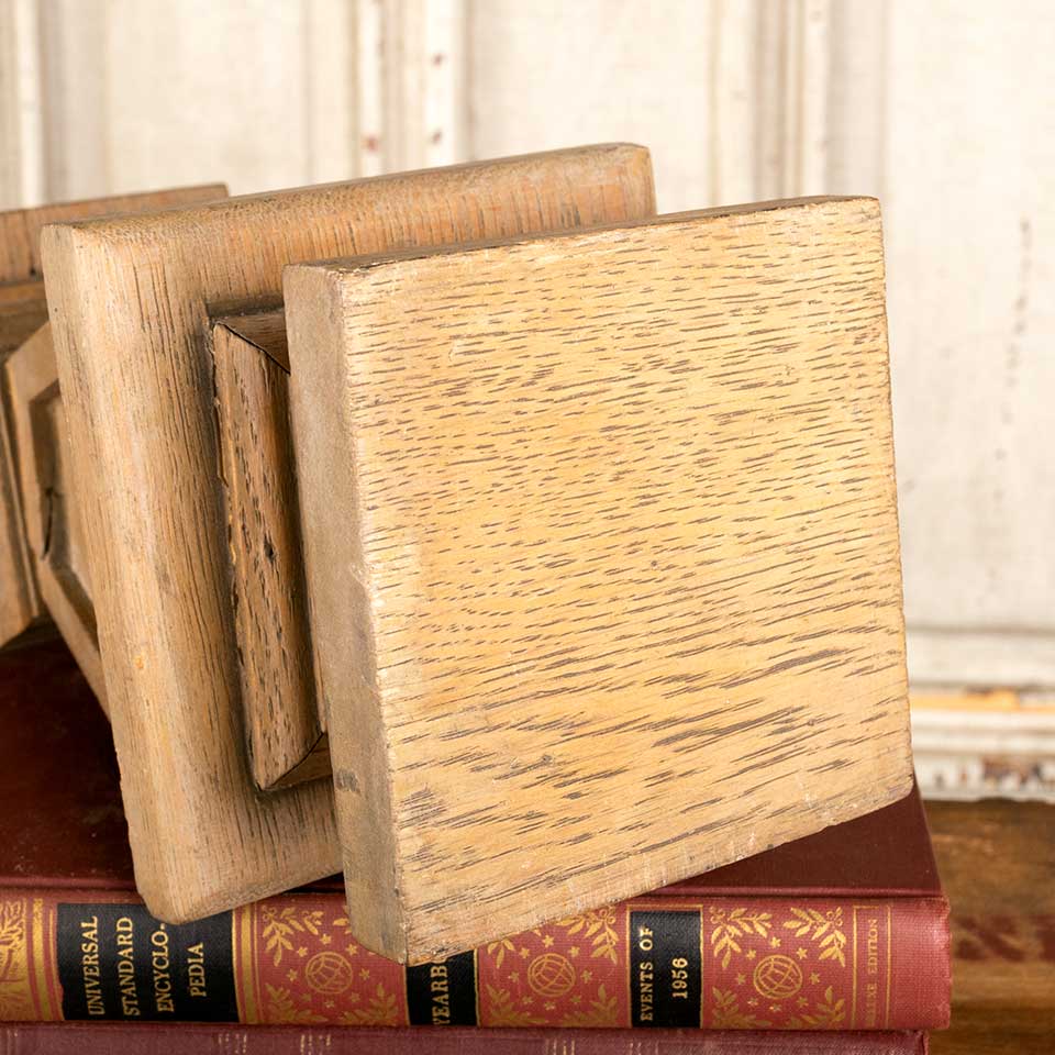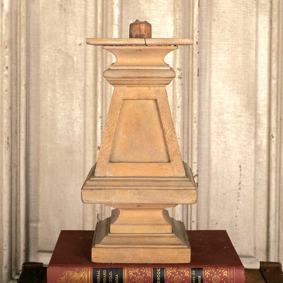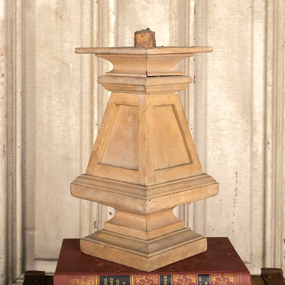 Architectural salvage antique oak finial measuring approx. 9 3/4" tall (not including dowel on top) with a 4 3/8" square base, a 5" square middle, and a 4 1/2" square top. See photos to evaluate condition.