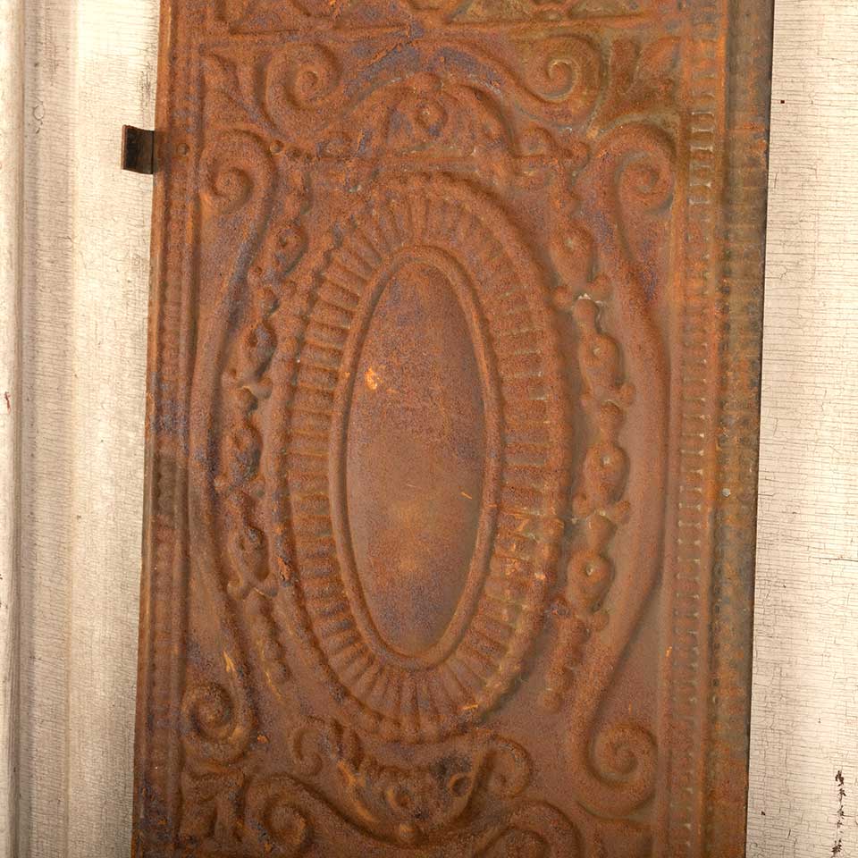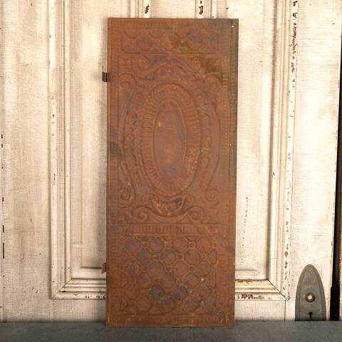 Architectural salvage antique rusty stamped metal fireplace fireback panel measuring approx. 12 1/2" wide (not including tabs) x 29 1/2" tall x 1/8" thick. See photos to evaluate condition.