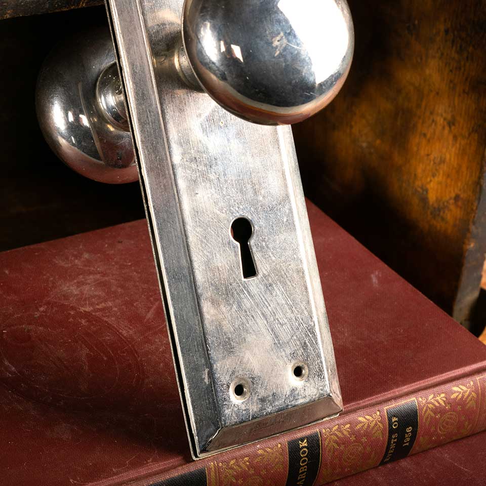 Architectural salvage vintage chrome plated steel Yale interior doorknob door hardware set including a pair of 2 1/4" in diameter knobs, a 3-piece spindle with set screws, and a pair of 2 3/8" wide x 7 1/8" tall x 1/4" thick backplates. See photos to evaluate condition. Priced at $95 for the set.