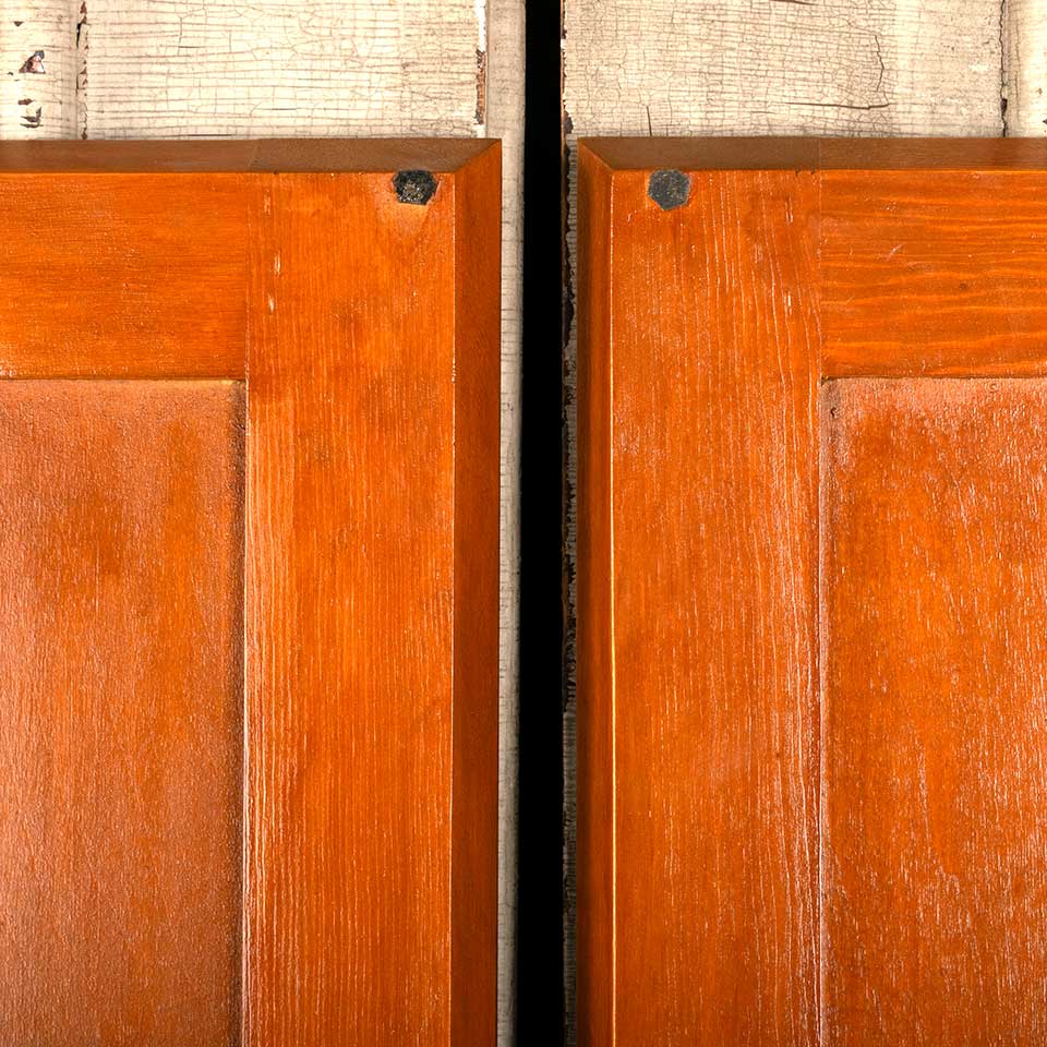 Pair of architectural salvage 18" cabinet doors together measuring approx. 36" wide x 23" tall x 1" thick. Color and condition may vary, see photos to evaluate. Priced at $50/pair.