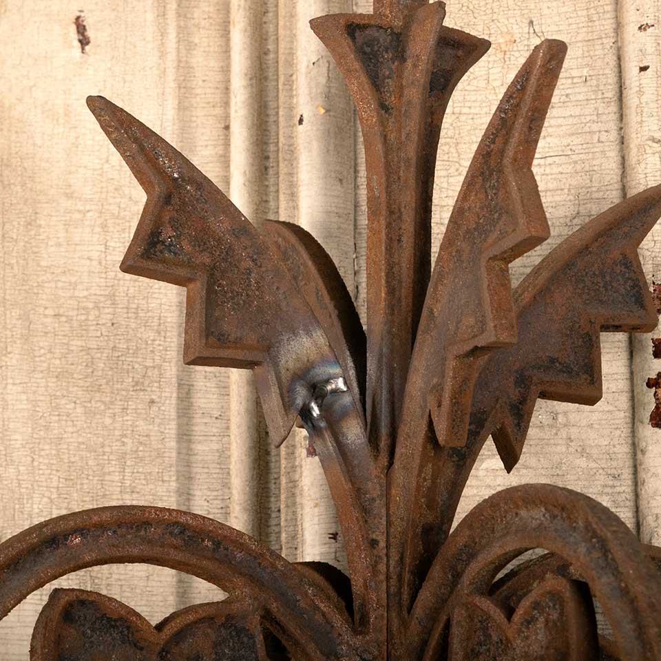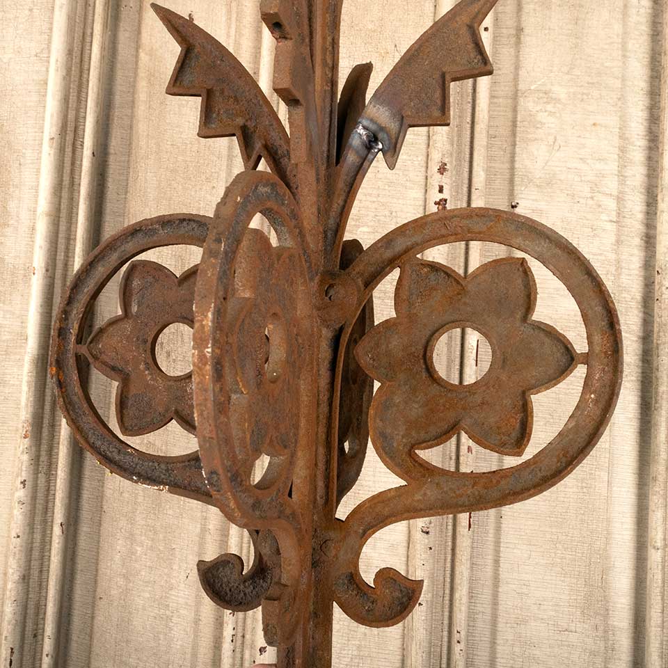 Architectural salvage antique ornate cast iron widow's walk corner post measuring approx. 13 1/4" x 13 1/4" x 42 7/8" tall. There is a repair on the piece. See photos to evaluate condition.