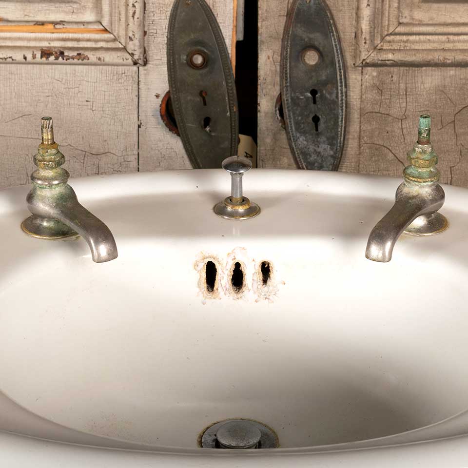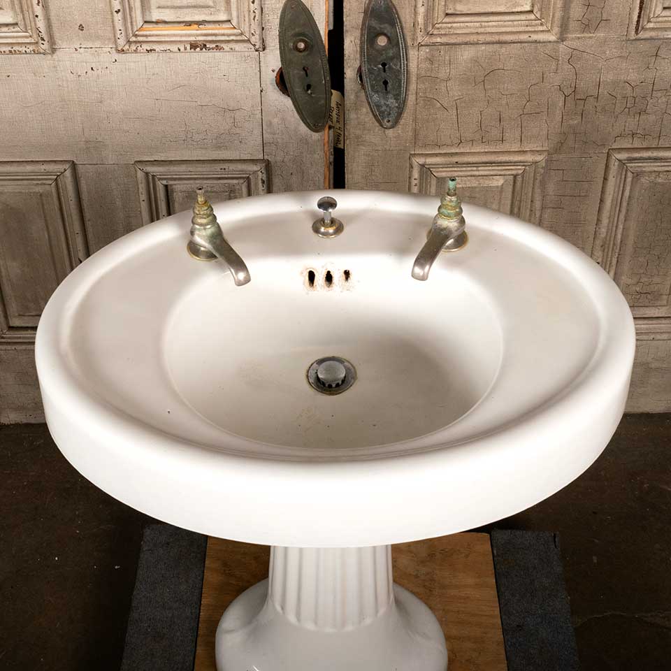Architectural salvage antique cast iron porcelain enameled bathroom pedestal sink with fluted base measuring approx. 27 1/2" wide x 31" tall x 18 3/4" front to back. Faucets included, but not guaranteed to be in working order. See photos to evaluate condition.