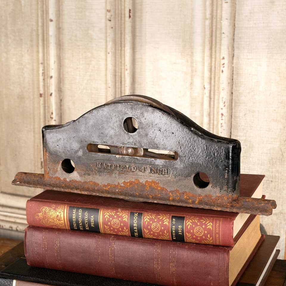 Architectural salvage antique cast iron roller pocket door trolley hardware measuring approximately 1 1/4" wide x 4 1/4" tall x 10 7/8" long with a 4" diameter functioning trolley wheel. Marked on one side HATFIELD 4 INCH and 4 INCH RUN on the other. Color and condition vary, see photos to evaluate. Priced at $95/each.