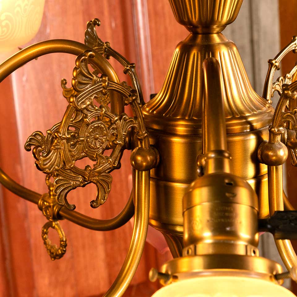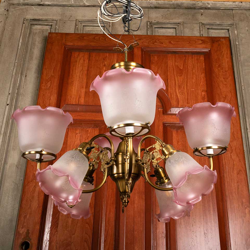 Architectural salvage reproduction antique Victorian eight light chandelier with etched glass shades measuring approx. 30 1/2" in diameter x 22" tall. This fixture includes an 83 1/2" long brass riser if a taller fixture is required. Salvaged light fixtures should be inspected by a licensed electrician prior to installation. See photos to evaluate condition.