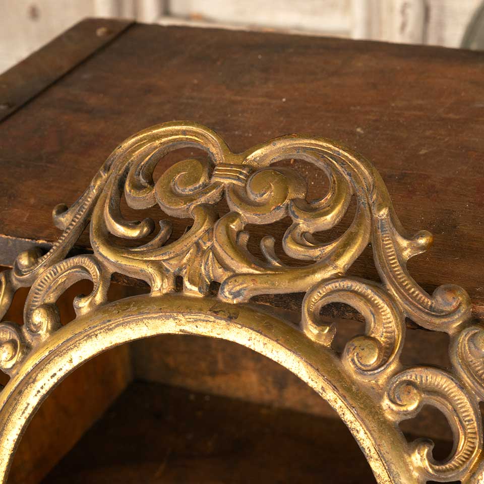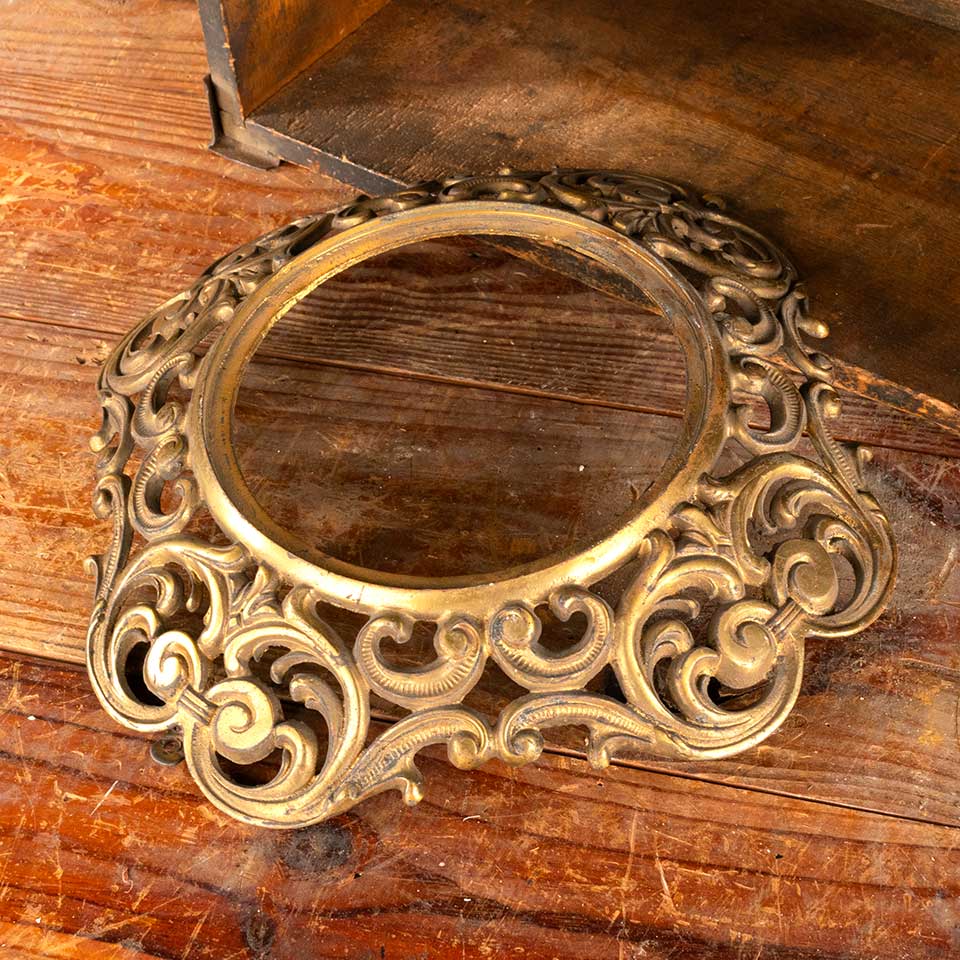 Architectural salvage antique brass ornate filigree frame surround measuring approx. 10 3/8" x 10 3/8" x 1 3/4" front to back with a 5 7/8" diameter opening (inside rim). See photos to evaluate condition.