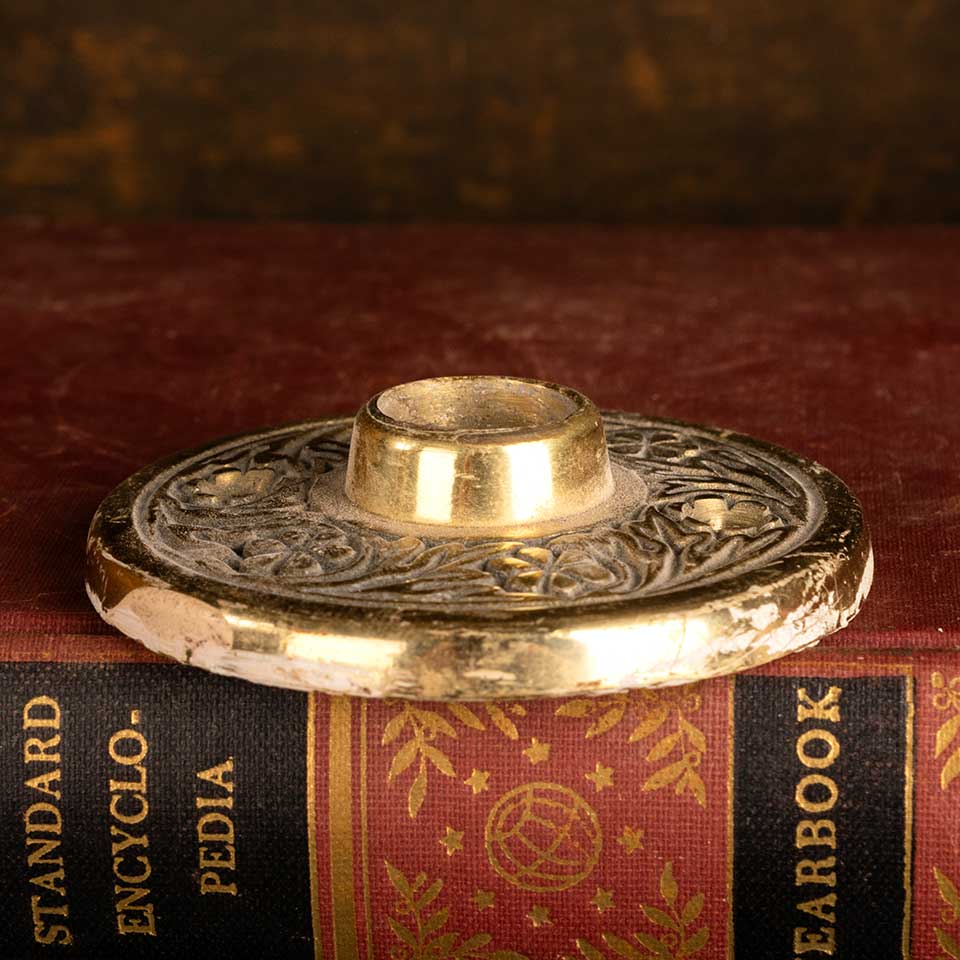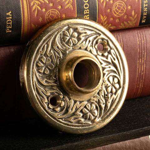 Architectural salvage reproduction large ornate brass doorknob rosette door hardware measuring approx. 2 1/2" in diameter with a 3/4" diameter collar. Color and condition vary, see photos to evaluate condition. Priced at $20/each.