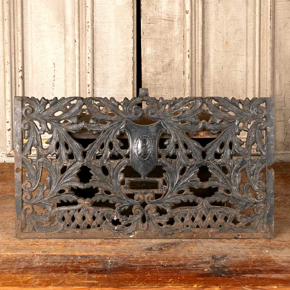 Architectural salvage antique cast iron fireplace ember screen measuring approx. 20 3/16" wide x 11" tall (not including top tab) x 3/8" front to back. There's a crack and some material loss at the right side screw hole. See photos to evaluate condition.