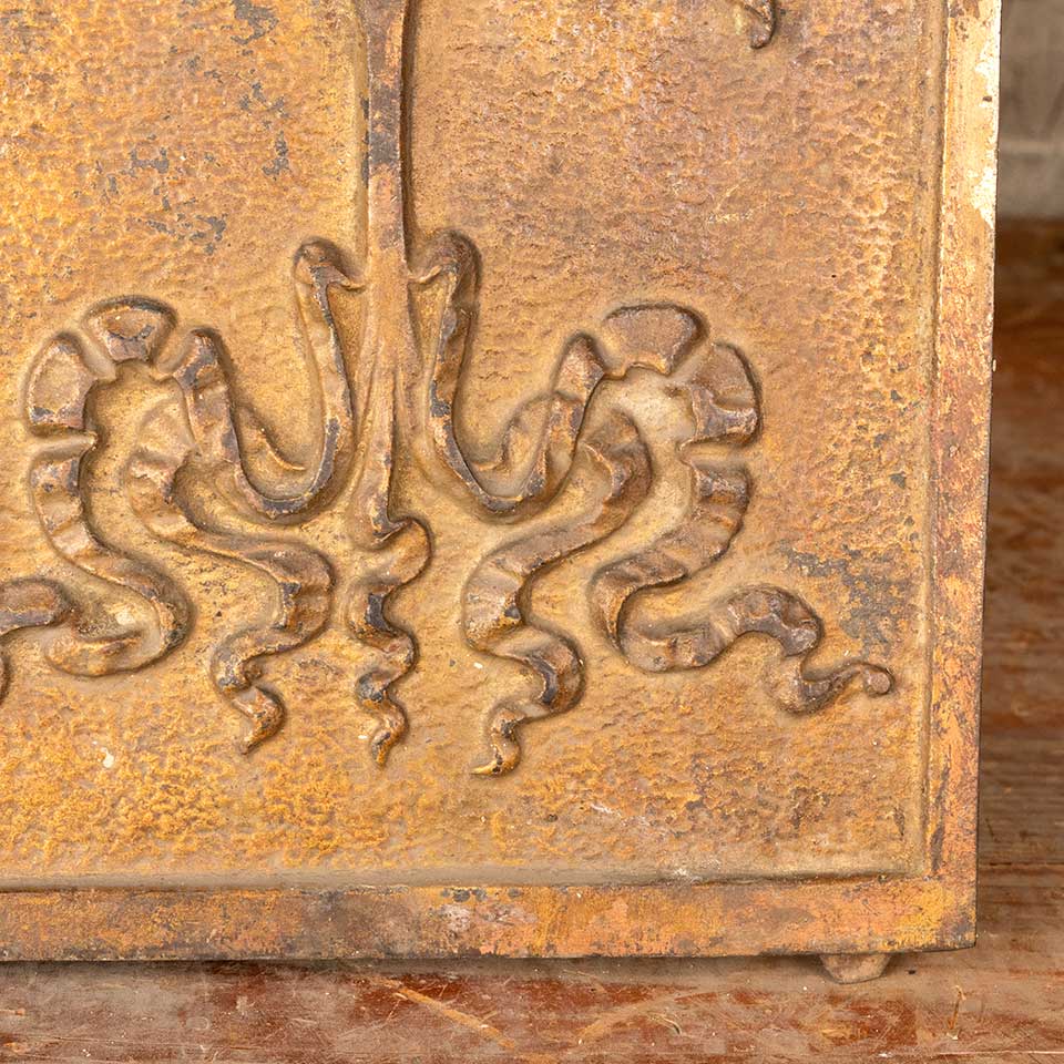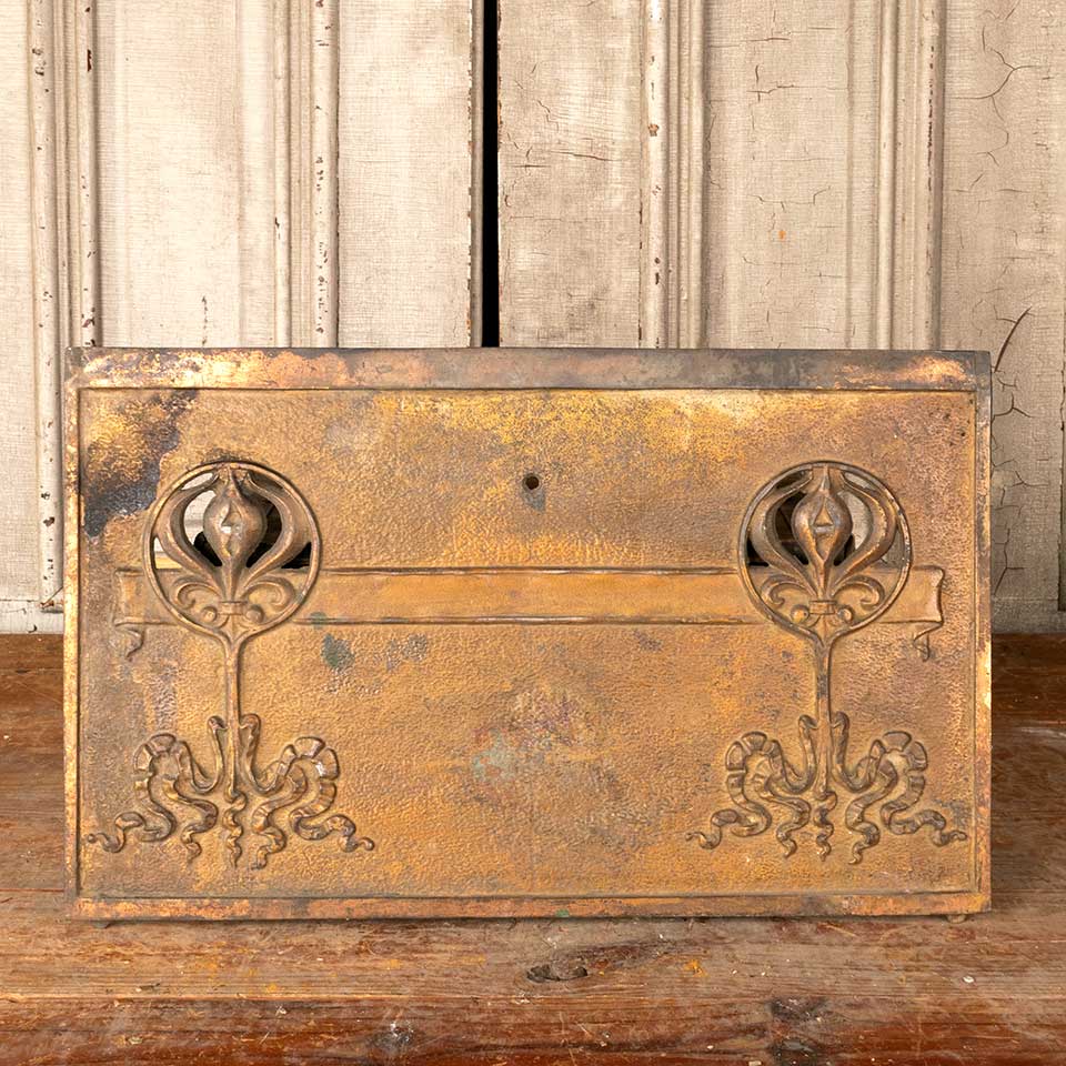 Architectural salvage antique cast iron fireplace summer front cover measuring approx. 19 7/8" wide x 12 1/5" tall (not including bottom tabs) x 3/8" front to back. See photos to evaluate condition.