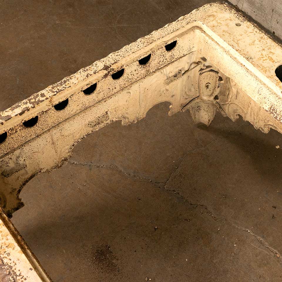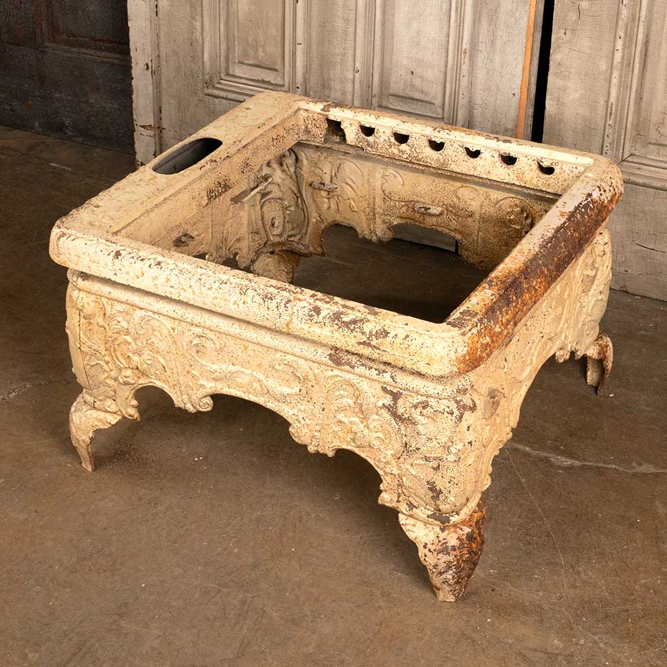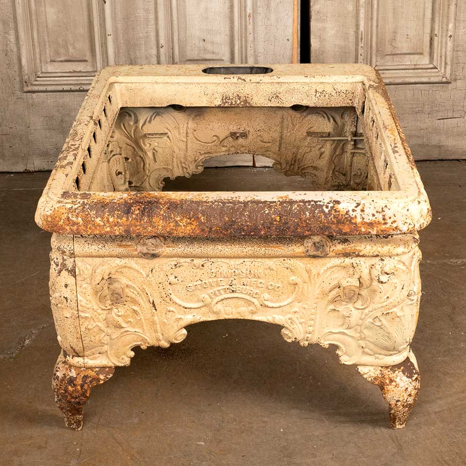 Architectural salvage antique ornate cast iron stove base measuring approx. 24" wide x 17" tall x 27" front to back. This piece is marked SIMPSON STOVE & MFG CO. PITTSBURG. See photos to evaluate condition.