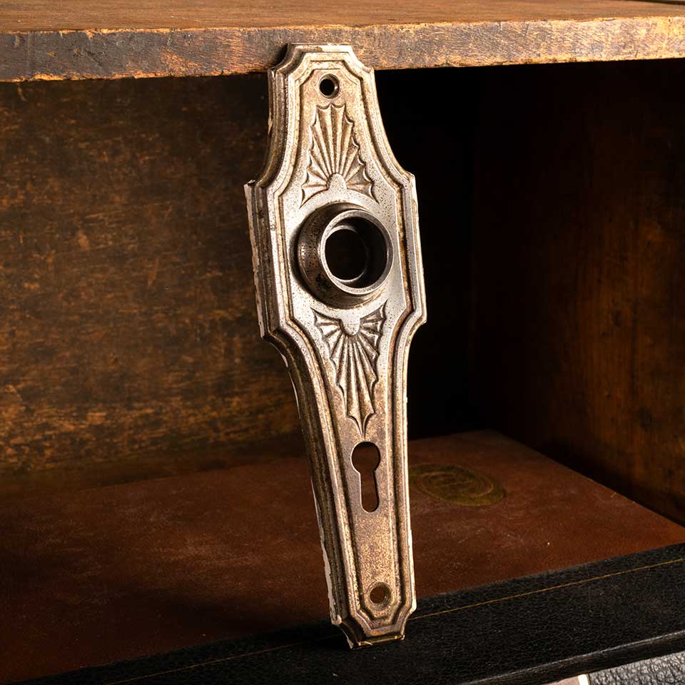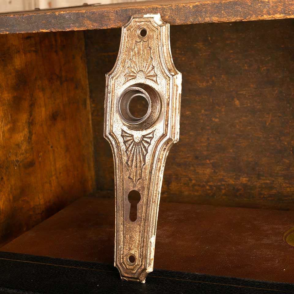 Architectural salvage antique steel Russell & Erwin Juno pattern (c. 1930) doorknob backplate door hardware measuring approx. 2" wide x 6 1/2" tall with a 7/8" diameter collar. The spindle and keyhole measure 2 1/2" on centers. See photos to evaluate condition.