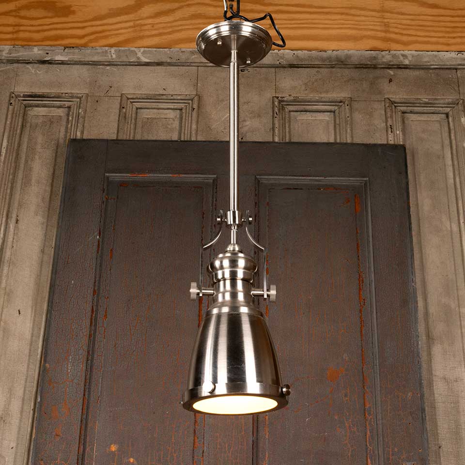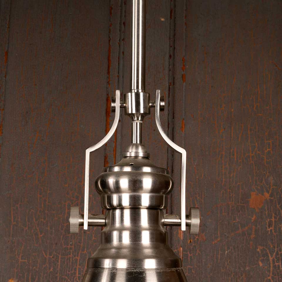 Architectural salvage modern industrial style pendant light fixture measuring approx. 7 3/4" in diameter x 28 1/4" tall. See photos to evaluate condition. Salvaged lighting should be inspected by a licensed electrician prior to installation.