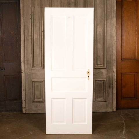 Architectural salvage antique five panel painted wood interior door with mortise lock measuring approx. 28 1/4" wide x 75 1/8" tall x 1 3/8" thick. There's some wood loss at the top corner of the hinged side of the door on one side. See photos to evaluate condition.