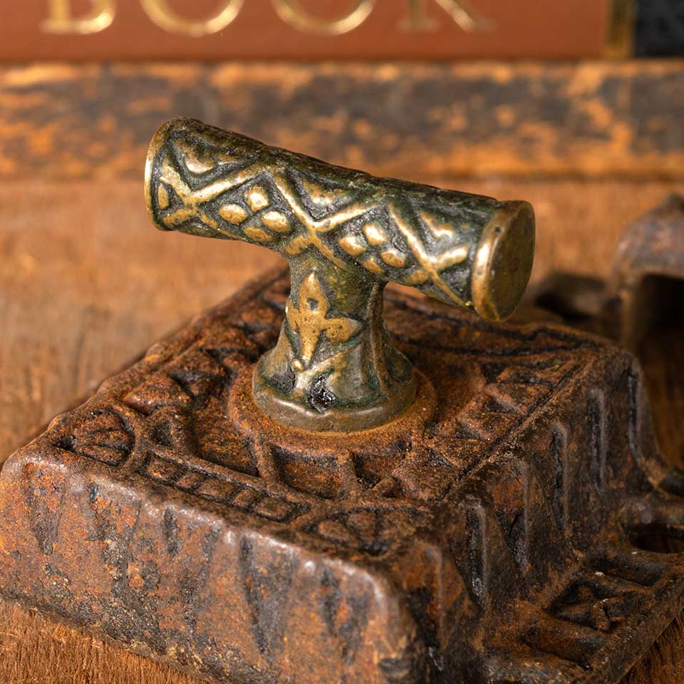 Architectural salvage antique ornate Victorian spring loaded cast iron & brass kitchen cabinet pantry door latch and catch hardware. The latch measures approx. 1 5/8" wide x 2 1/8" tall x 1 1/4" front to back and the catch measures approx. 5/8" wide x 2 1/4" tall x 5/8" front to back. Color and condition may vary, see photos to evaluate. Priced at $65/each.
