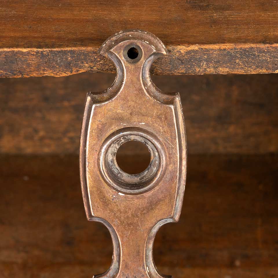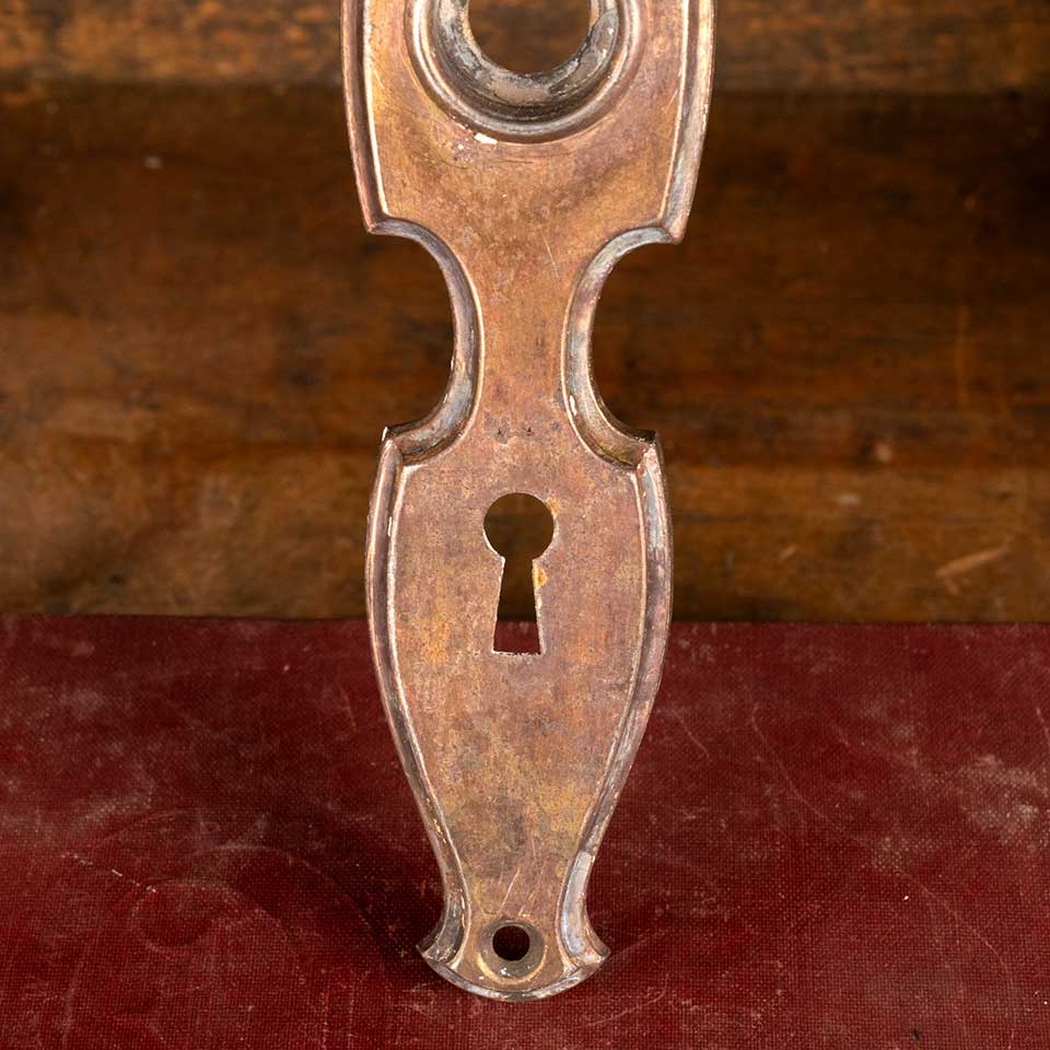 Architectural salvage antique stamped / pressed steel doorknob backplate door hardware with keyhole measuring approx. 1 1/2" wide x 6 1/4" tall with a 7/8" diameter collar. Spindle and keyholes measure 2 1/2" on center. Color and condition may vary, see photos to evaluate. Priced at $15/each.