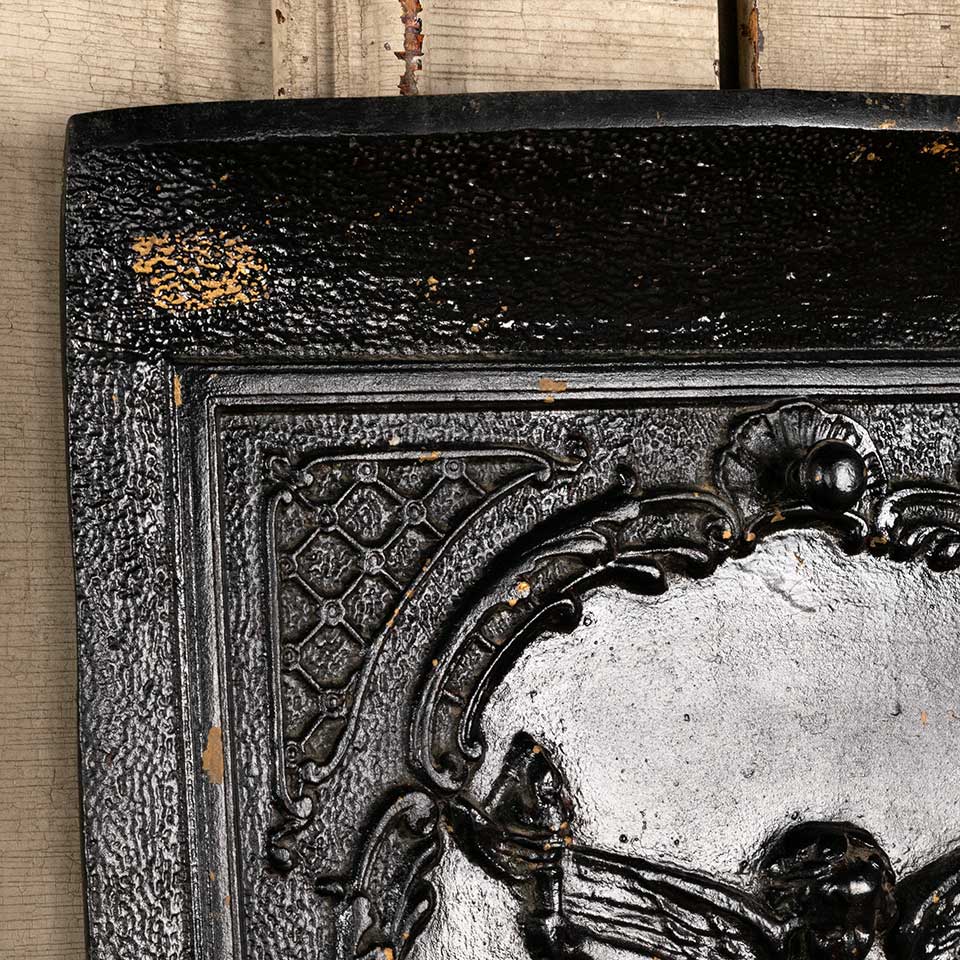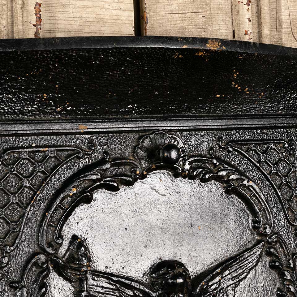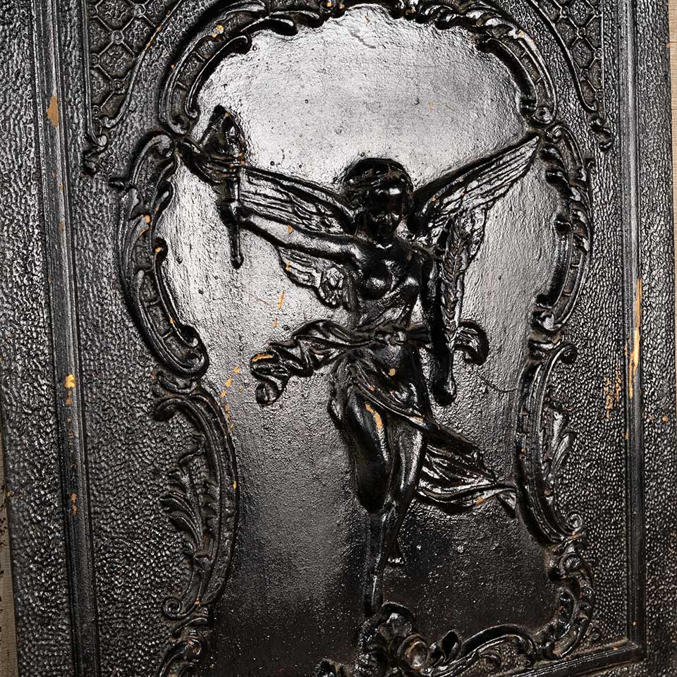 Architectural salvage antique cast iron fireplace summer front cover with angel motif measuring approx. 20" wide x 25 7/8" tall (at top center) x 2 1/4" front to back. See photos to evaluate condition.