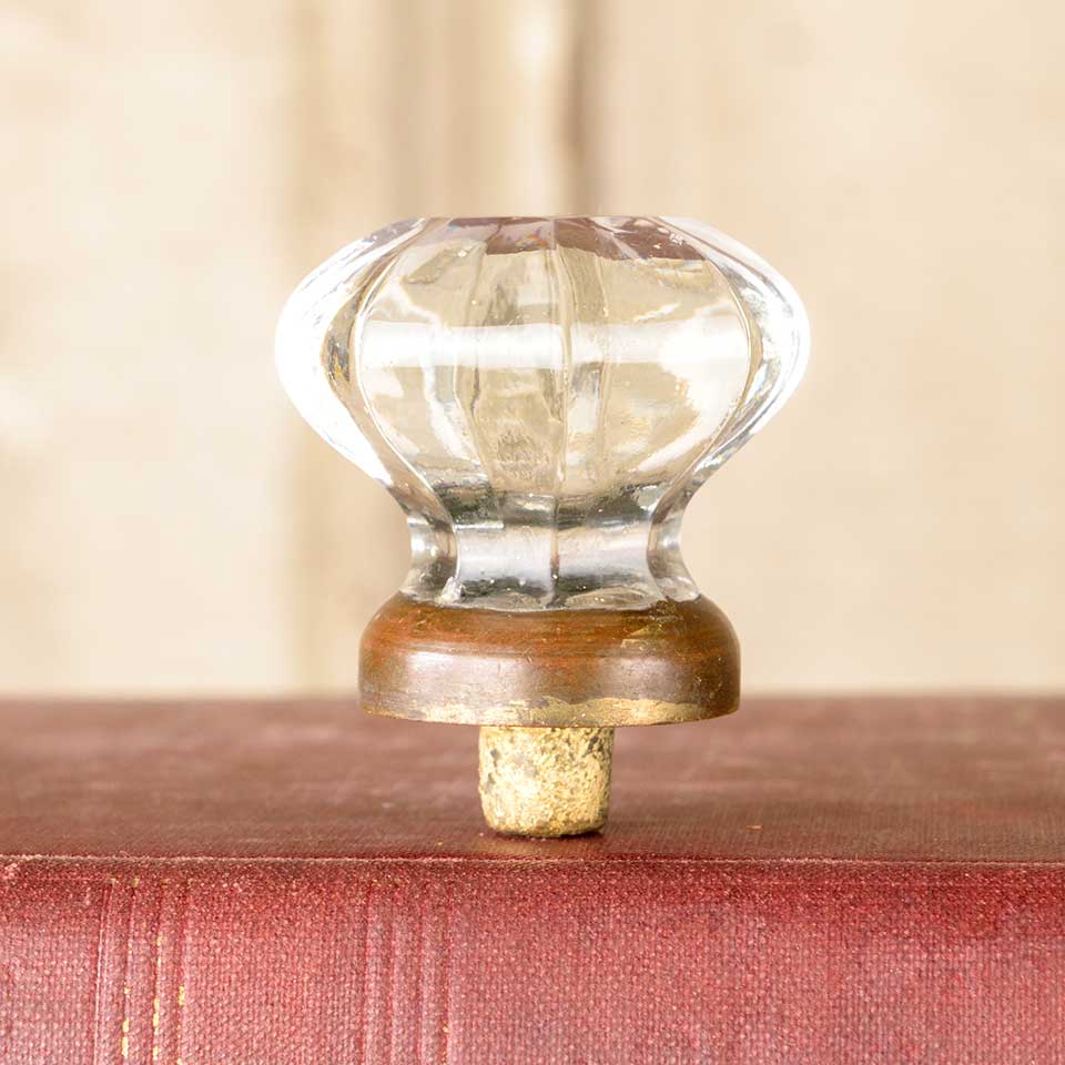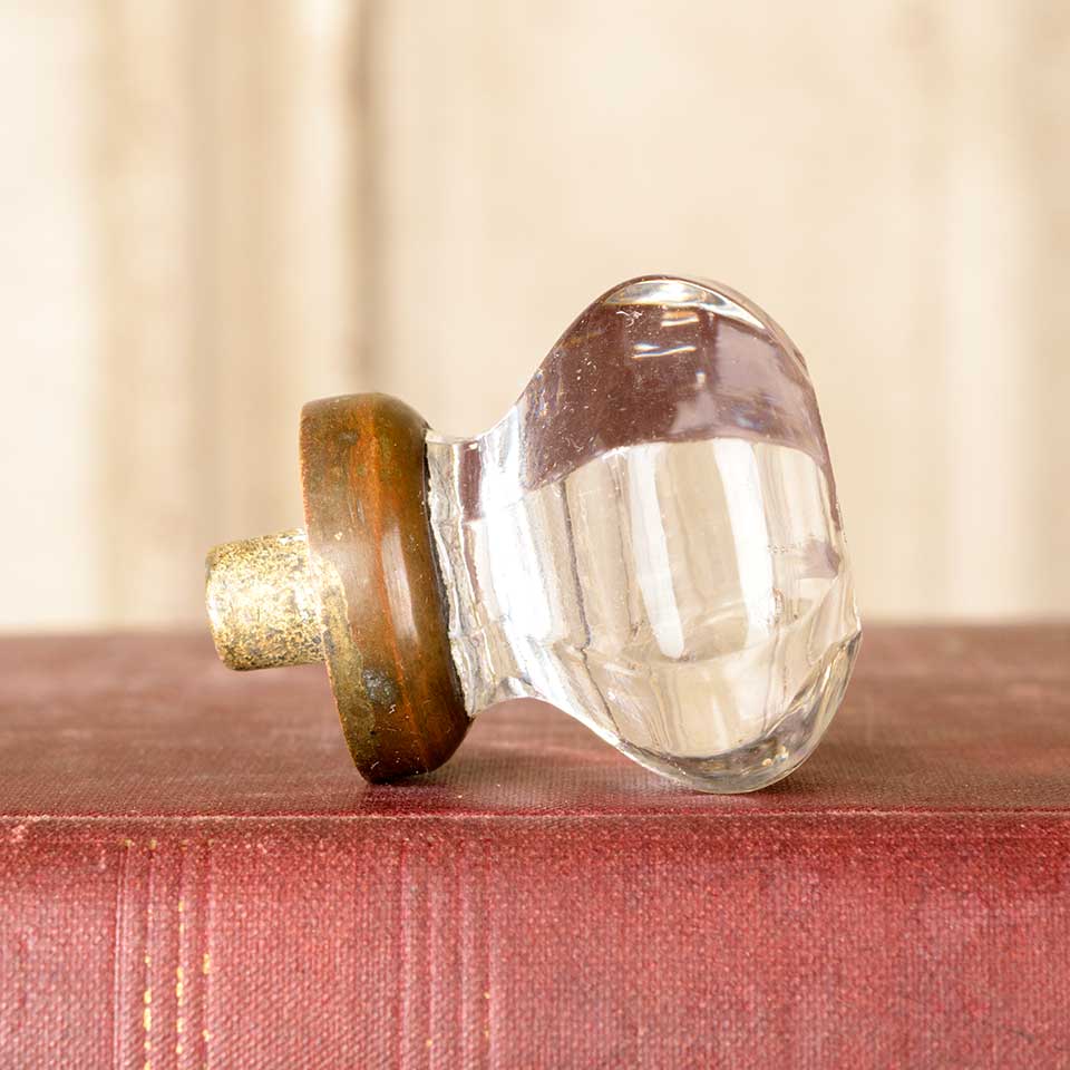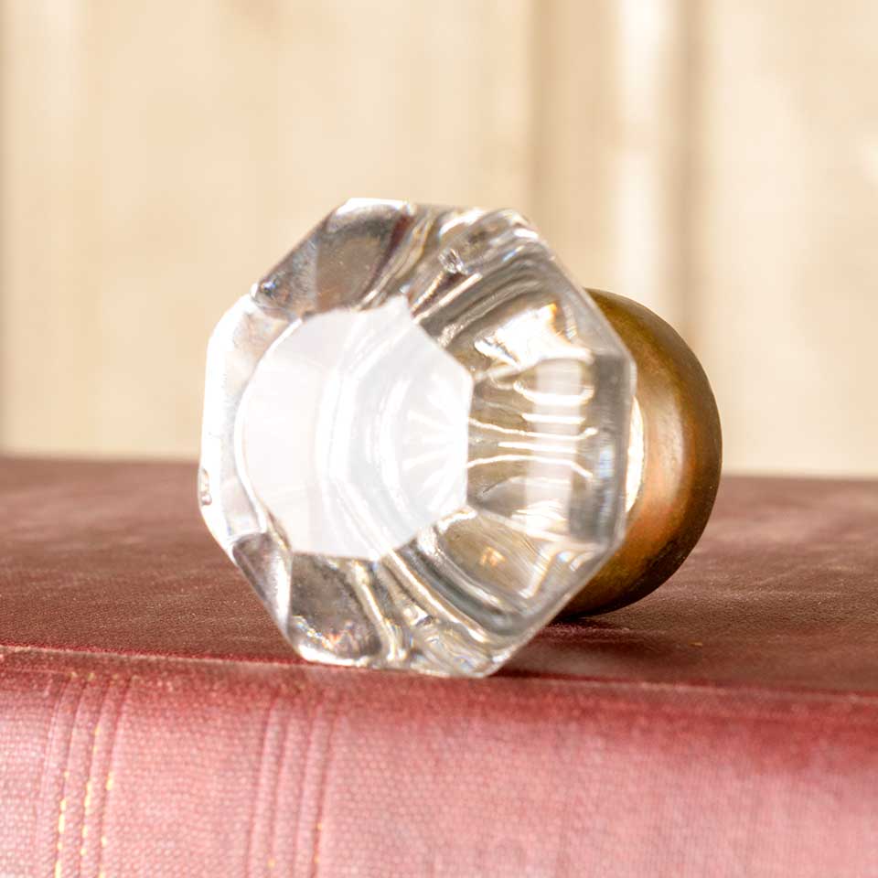 Architectural salvage antique octagonal clear pressed glass furniture drawer / cabinet knob hardware with brass collar measuring approx. 1 3/8" in diameter x 1 1/2" front to back. Mounting screw NOT included. Color and condition may vary.