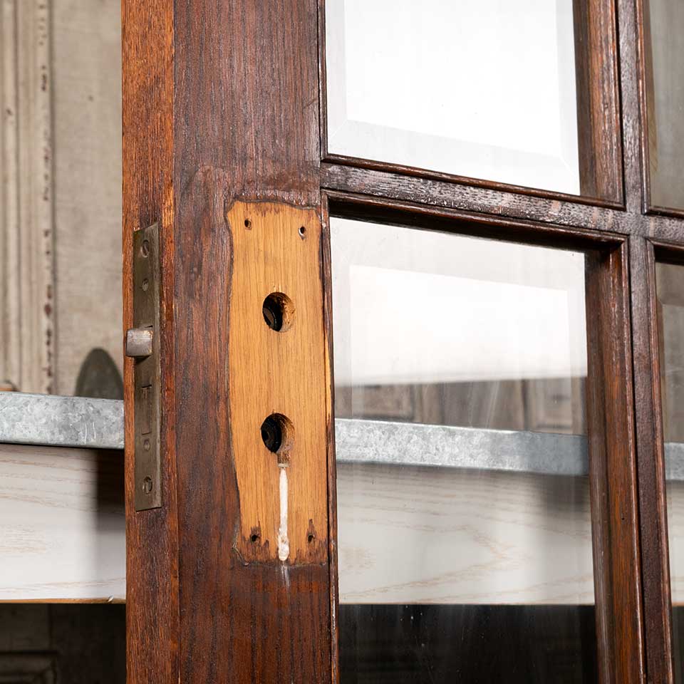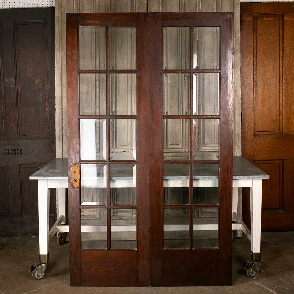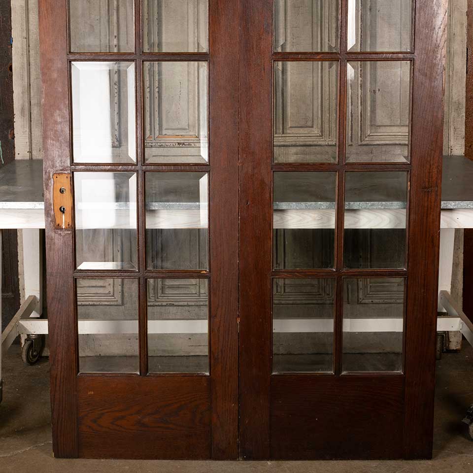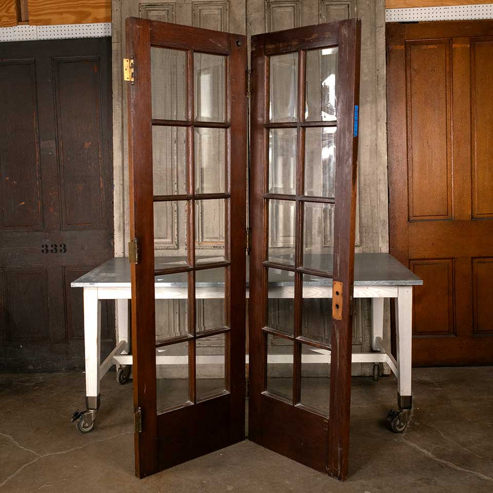 Architectural salvage antique oak bi-fold ten lite interior French doors with beveled glass panels together measuring approx. 48 7/8" wide x 80 11/16 - 81 1/4" tall (probably cut to match an uneven floor) x 1 3/4" thick. Includes a mortise lock and hinges. See photos to evaluate condition. Priced at $1,950 for the set.