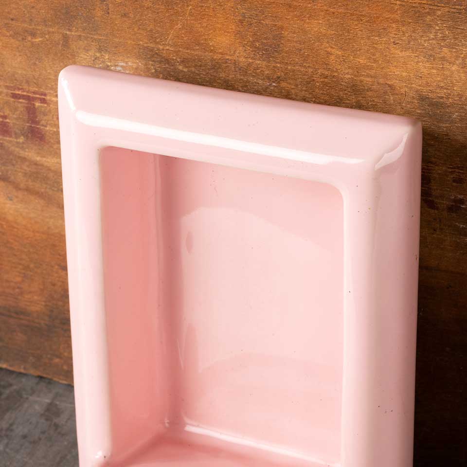 Architectural salvage vintage pink in-the-wall bathroom soap dish niche measuring approx. 4 3/4" wide x 6 1/2 tall x 3" front to back. See photos to evaluate condition.