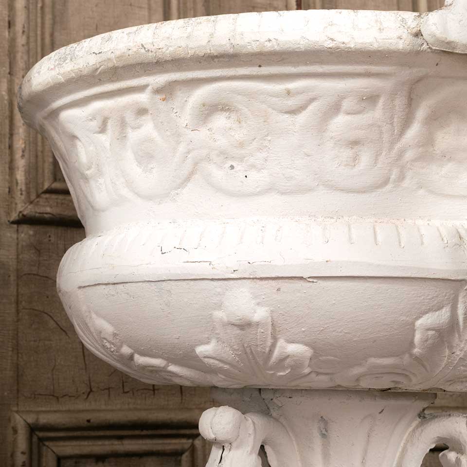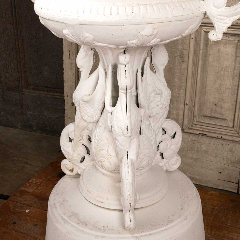 Pair of architectural salvage cast aluminum handled garden planter urns with swans each measuring approx. 29 1/2" wide x 40" tall (overall) with a 20" diameter bowl and a 20 1/2" diameter base. See photos to evaluate condition. Priced at $5,500 for the pair.