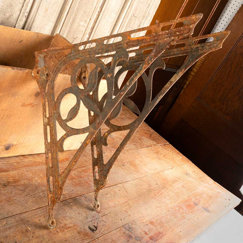 Pair of architectural salvage antique cast iron bathroom marble top sink brackets each measuring approx. 2 3/8" wide (widest point) x 16" tall x 15 7/8" front to back. See photos to evaluate condition. Priced at $275 for the pair.