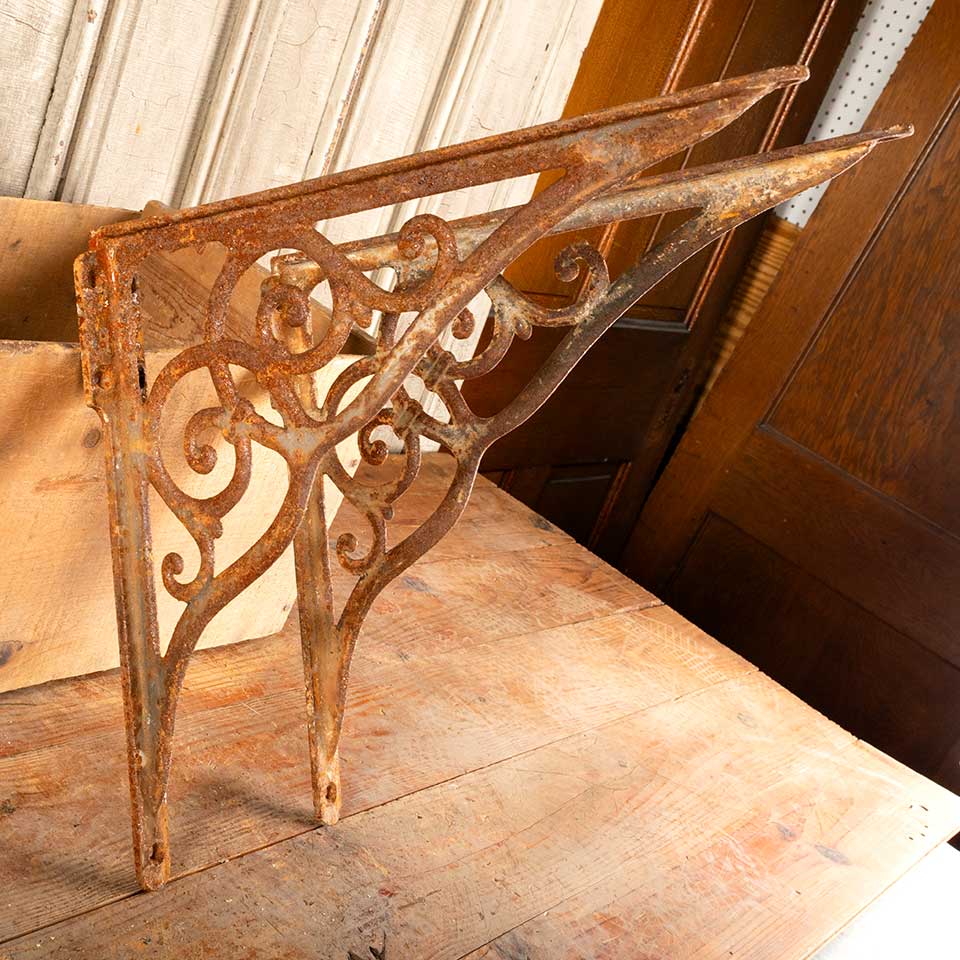 Pair of architectural salvage antique cast iron bathroom marble top sink brackets each measuring approx. 2" wide (widest point) x 15 3/4" tall x 17 3/4" front to back. See photos to evaluate condition. Priced at $275 for the pair.