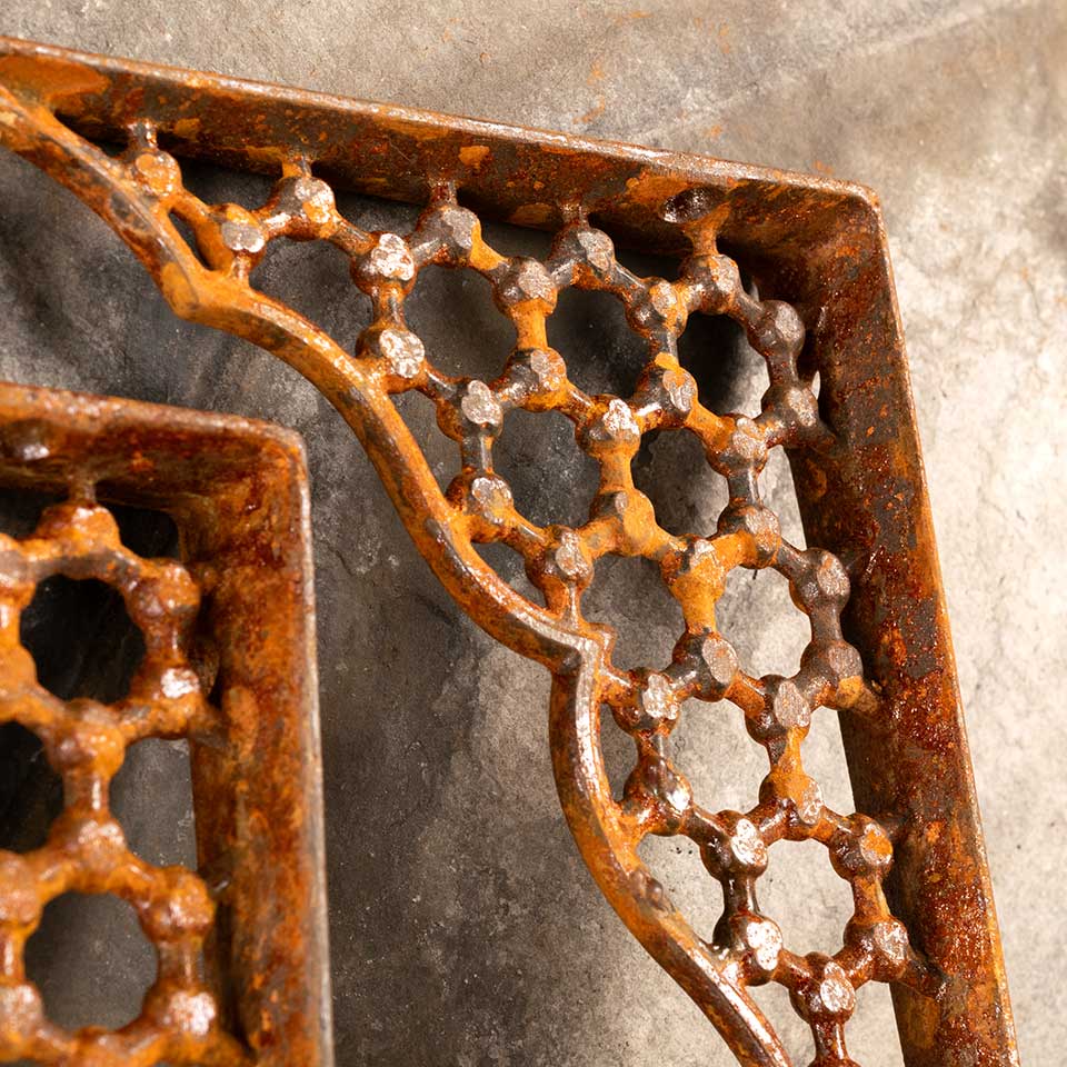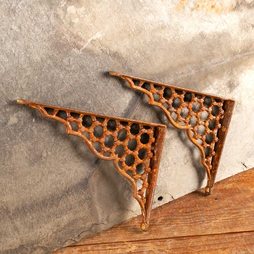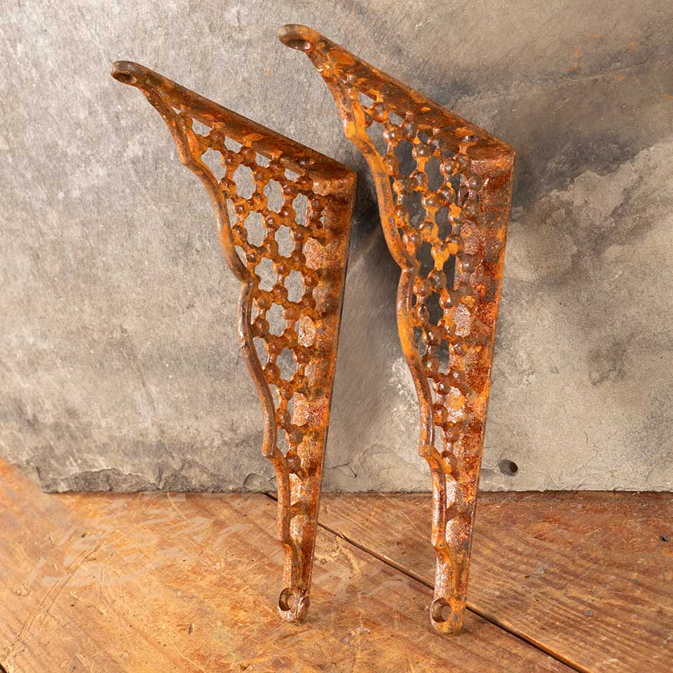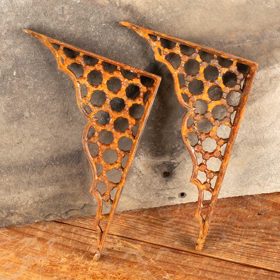 Pair of architectural salvage antique ornate cast iron shelf brackets each measuring approx. 7/8" wide (widest point) x 6 7/8" tall x 4 7/8" front to back. See photos to evaluate condition. Priced at $75 for the pair.