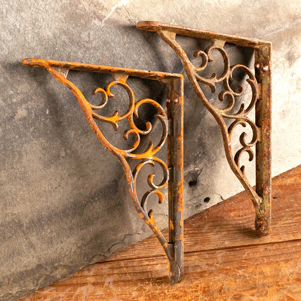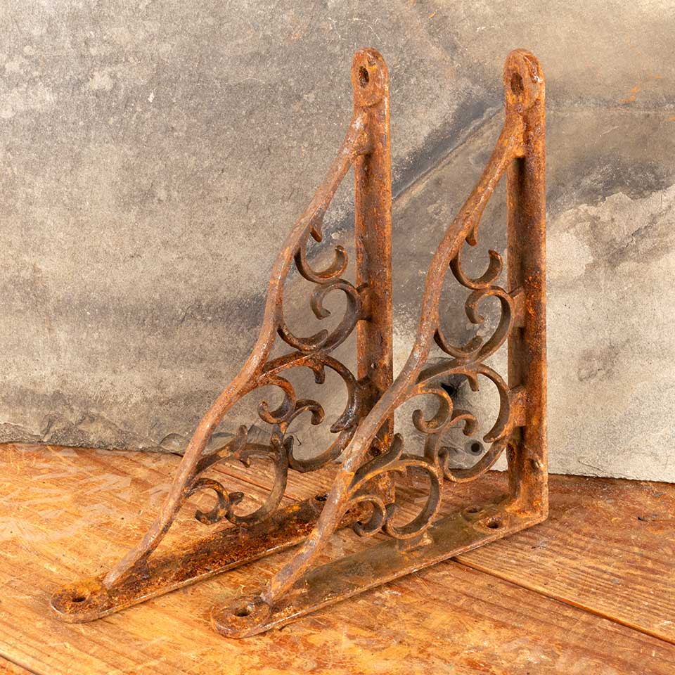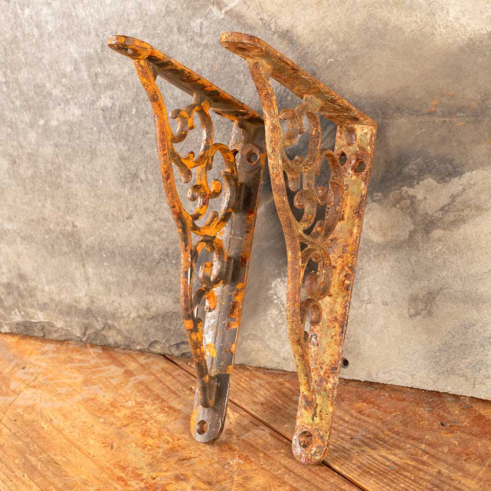 Pair of architectural salvage antique ornate cast iron shelf brackets each measuring approx. 7/8" wide (widest point) x 7 1/4" tall x 5 5/8" front to back. Color and condition may vary, see photos to evaluate. Priced at $75/pair.
