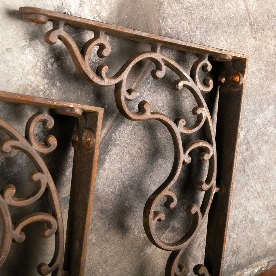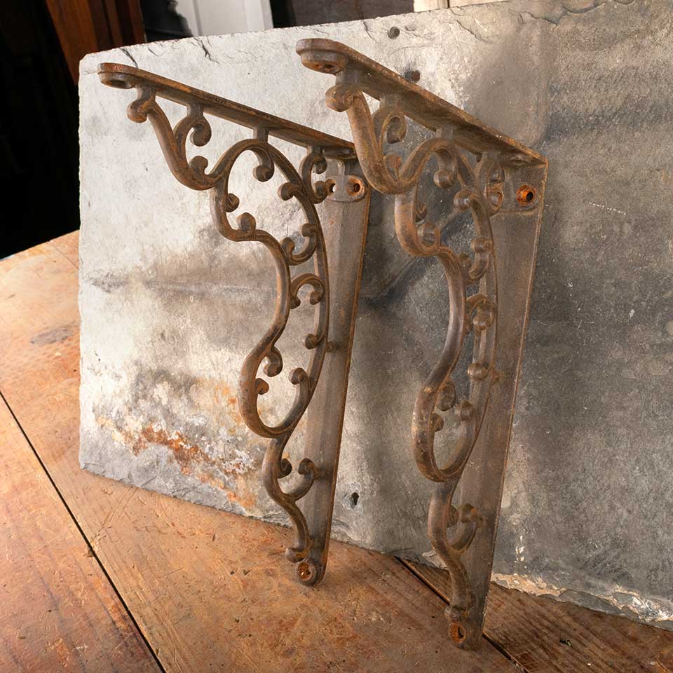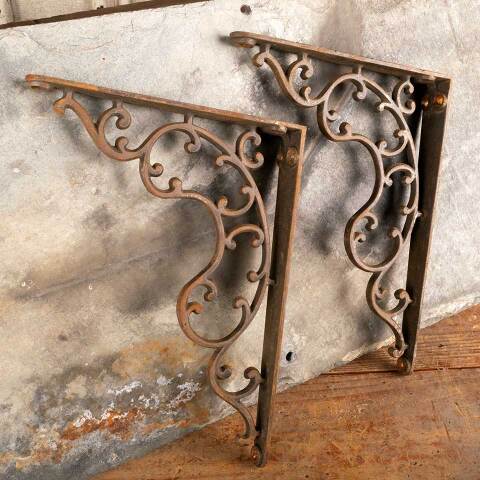 Architectural salvage antique ornate cast iron shelf brackets measuring approx. 1 1/8" wide (widest point) x 9 1/2" tall x 7" front to back. Color and condition may vary, see photos to evaluate. Priced at $175 a pair.